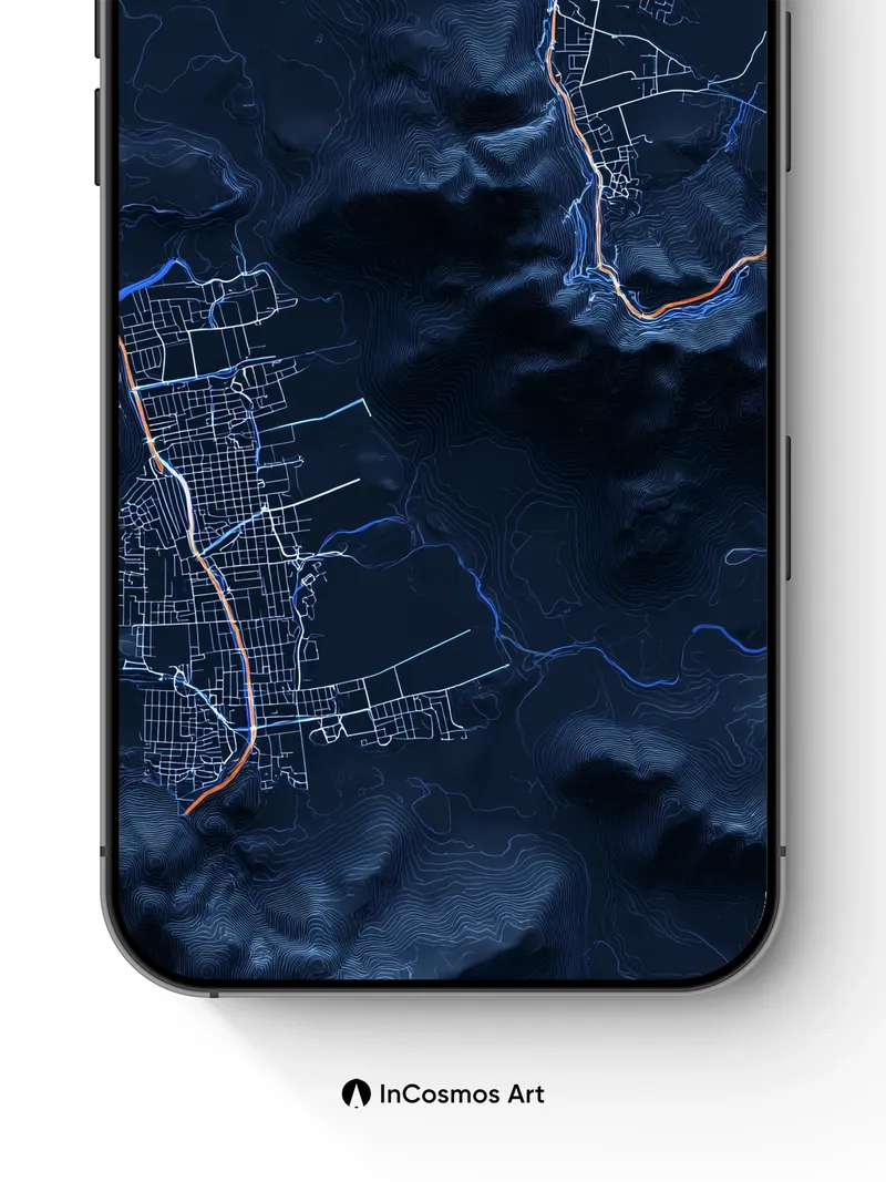 Debug page_description: Did you know that topographic lines once guided explorers through uncharted lands? Now, they pulse like neural circuits across a midnight canvas, where rivers glow in electric blue and roads trace faint orange veins through shadowed terrain. The city grids flicker like dormant data nodes, nestled between rolling hills that breathe in silent rhythm—each contour a whisper of the earth’s memory. Share this with your best friend. Send this to your love and swap a matching set. What if the map was never meant to be read, but felt?
