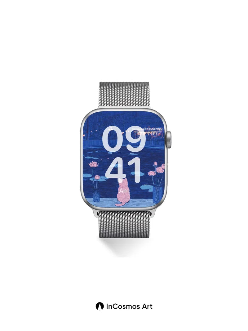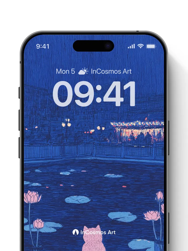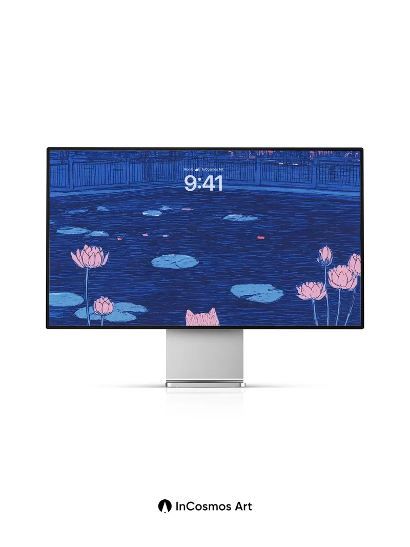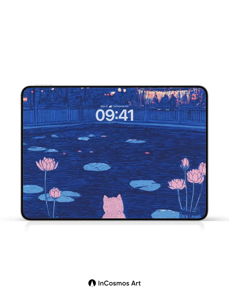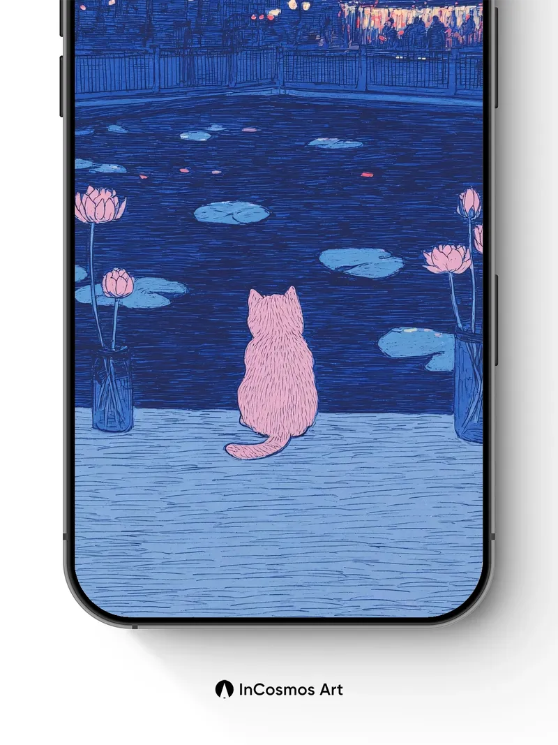 Nocturnal Reverie Wallpaper with Pink Cat and Lotus