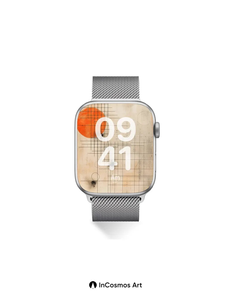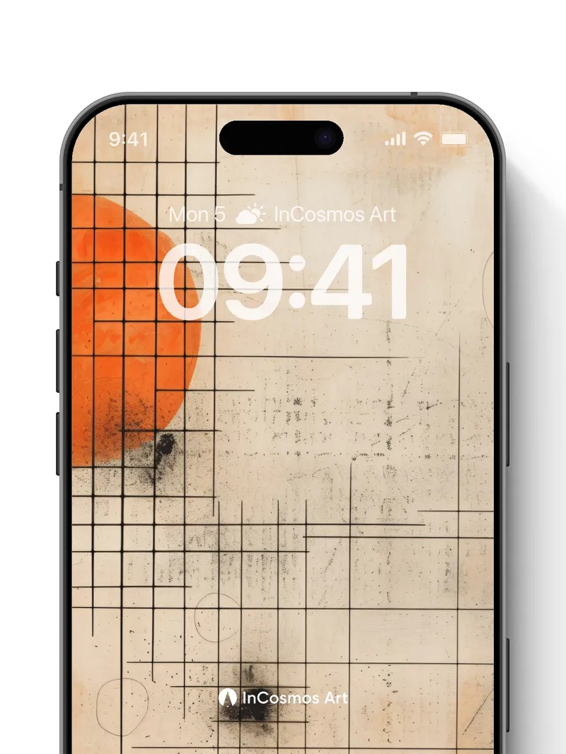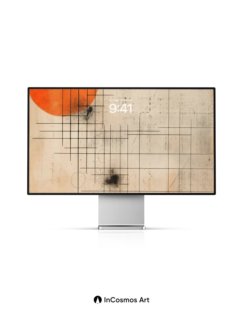 Debug page_description: Did you know that ancient Japanese scroll painters used rice paper and mineral pigments to create ethereal textures? Here, a faded orange sun hovers over a delicate lattice of intersecting lines, its warmth bleeding into the aged parchment surface like memory itself. The grid feels both architectural and fragile, as if drawn by hand in quiet contemplation, while faint circles and smudged ink stains whisper of forgotten equations and celestial charts. Share this with your best friend. Send this to your love and swap a matching set. What if every line on this wall held a secret from another time?