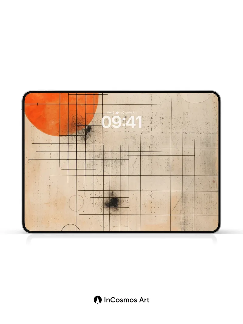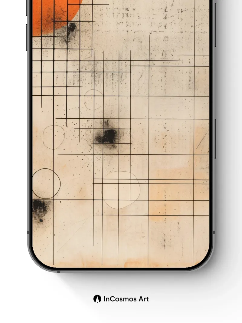 Did you know that ancient Japanese scroll painters used rice paper and mineral pigments to create ethereal textures? Here, a faded orange sun hovers over a delicate lattice of intersecting lines, its warmth bleeding into the aged parchment surface like memory itself. The grid feels both architectural and fragile, as if drawn by hand in quiet contemplation, while faint circles and smudged ink stains whisper of forgotten equations and celestial charts.