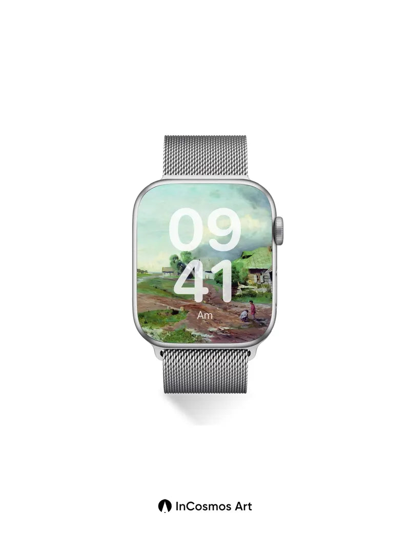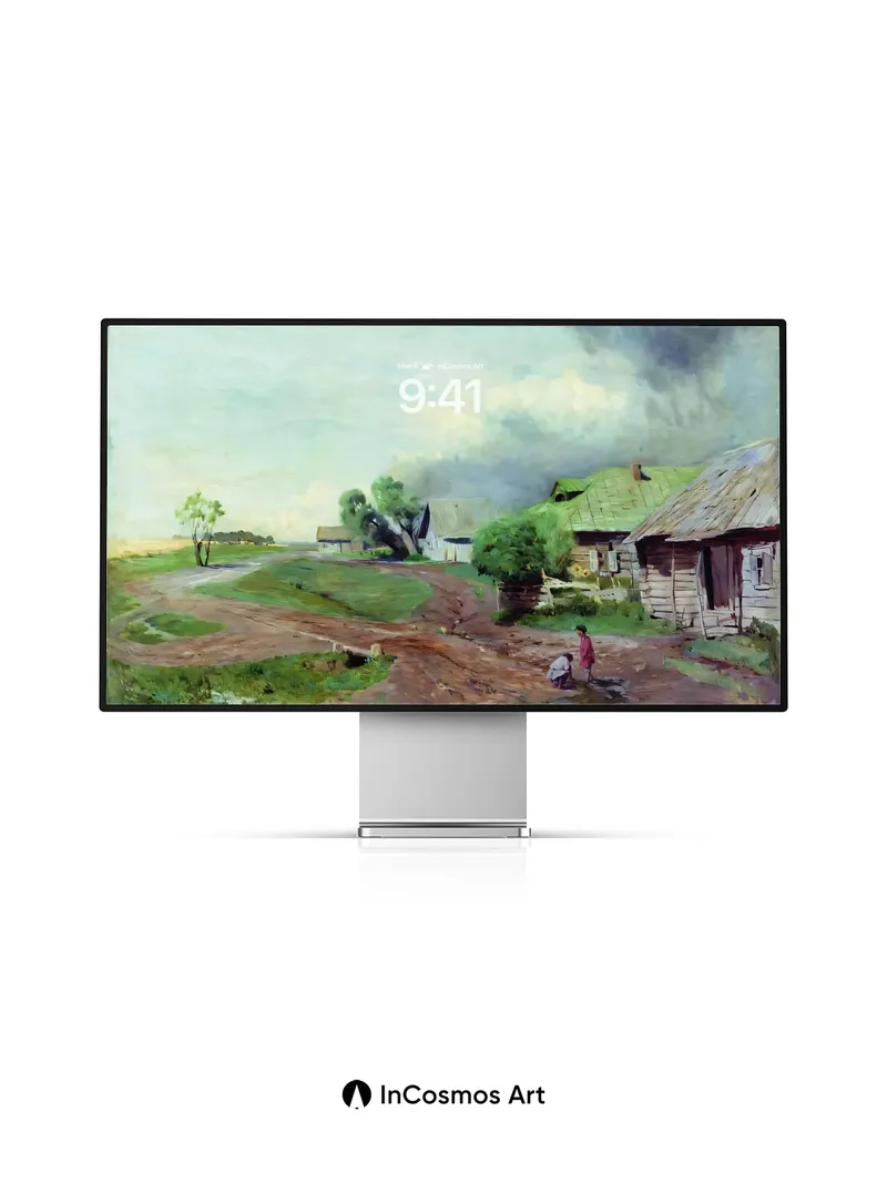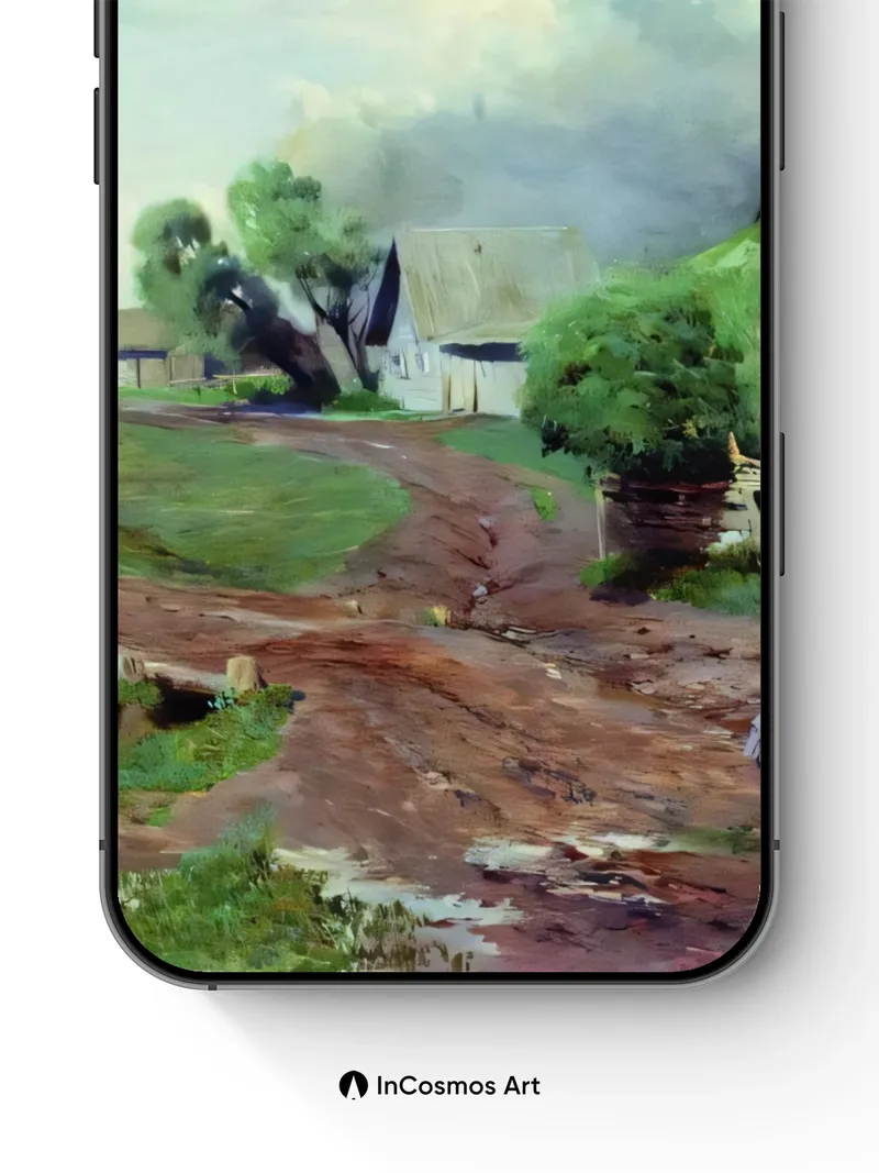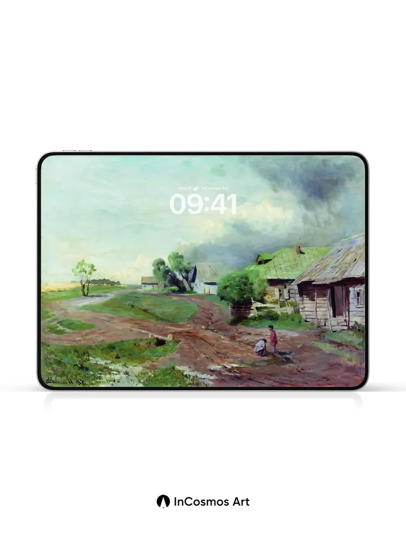 Debug product.metafields.custom.desc: Did you know that rural Russian landscapes in the early 20th century were often painted with a soft, diffused light to evoke memory and stillness? Here, earthy paths coil like sleeping serpents beneath a sky heavy with cloud, while wooden cottages breathe quiet history into the air. A lone figure bends near a well, their silhouette stitched into the scene like a thread of time.
