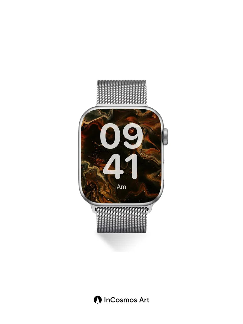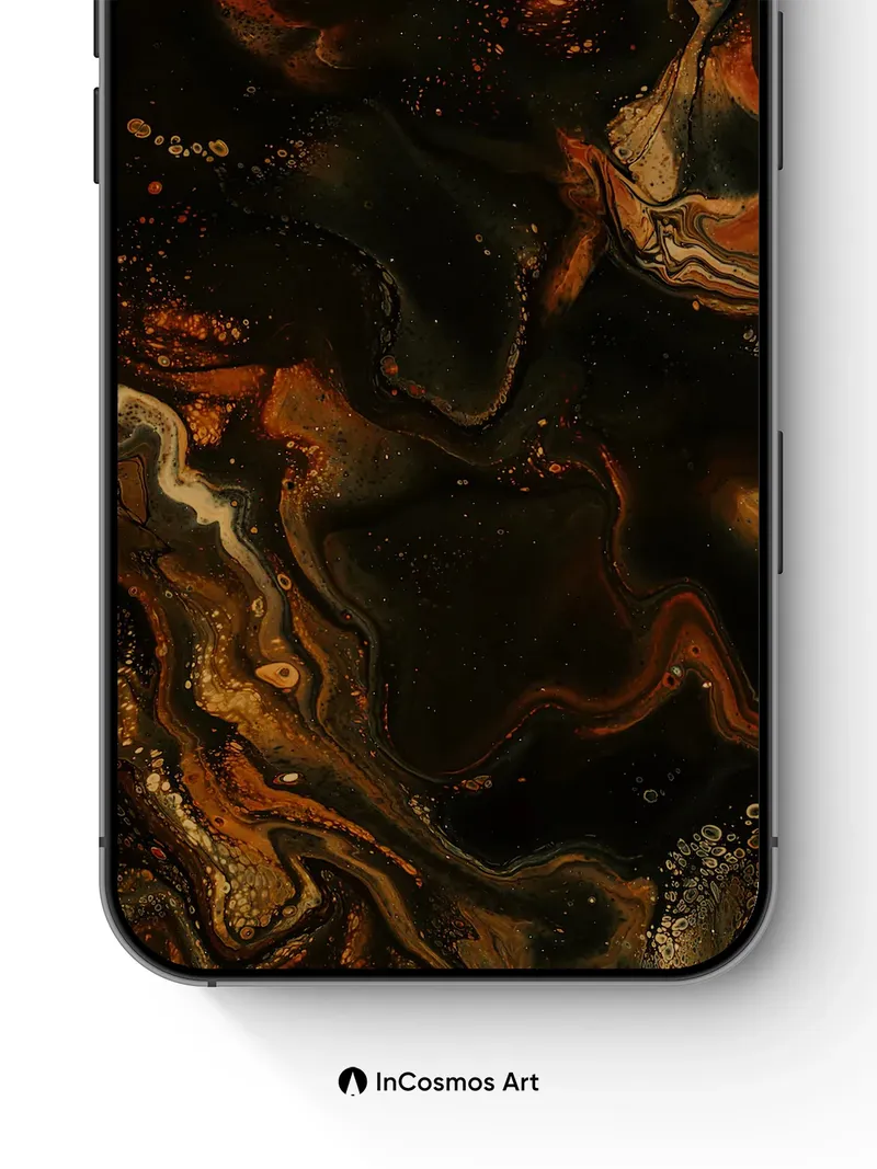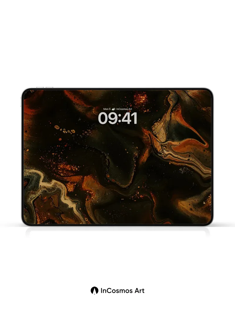 Debug page_description: Did you know ancient geologists believed agate formed from petrified lightning? This surface breathes like molten earth, where deep black pools fracture into rivers of burnt amber and gold dust, each swirl a fossilized memory of volcanic heat. Light crawls across the ridges like embers waking in slow motion, revealing textures that feel both brittle and alive. Share this with your best friend. Send this to your love and swap a matching set. What if your walls could remember fire?