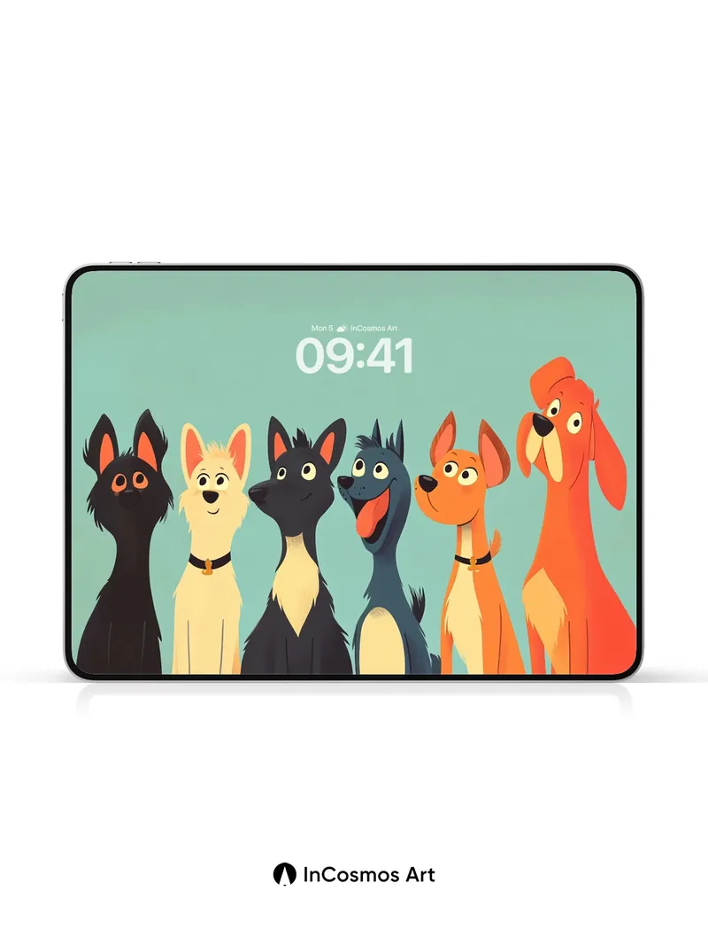 Debug page_description: Did you know that animated dogs in classic cartoons often had expressive eyes designed to mirror human emotions? Here, six stylized canines stand in a soft teal glow, their fur rendered in smooth, velvety gradients that seem to breathe with each shift of light. Their wide-eyed curiosity and gentle smiles invite you into a world where loyalty meets whimsy, where every wagging tail tells a story. Share this with your best friend. Send this to your love and swap a matching set. What if your walls could bark back?
