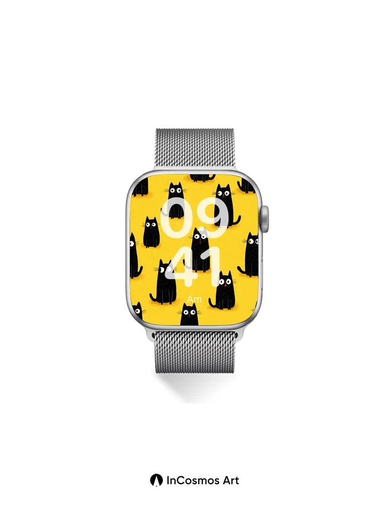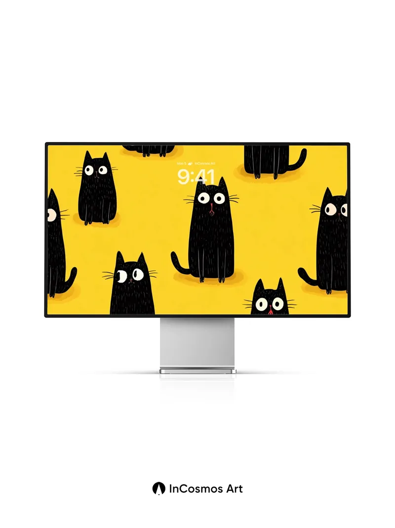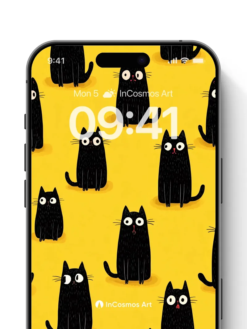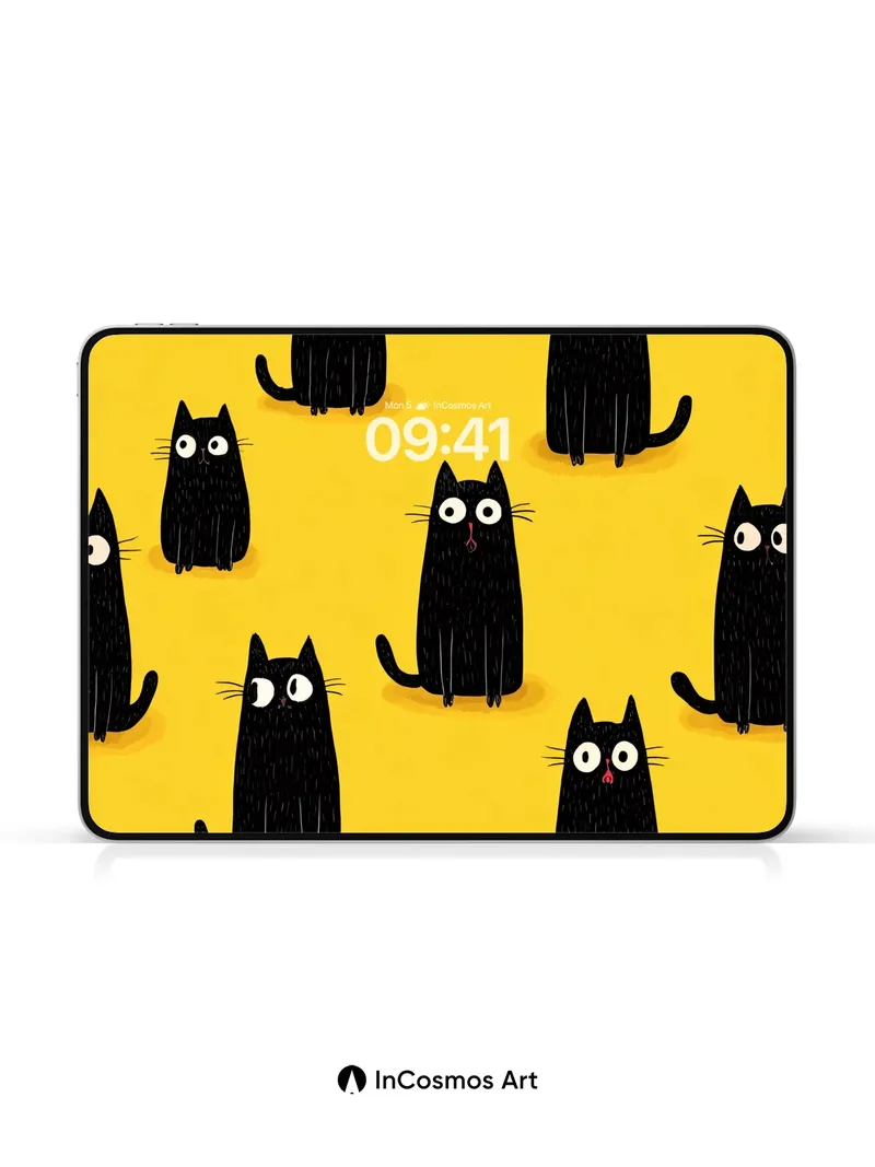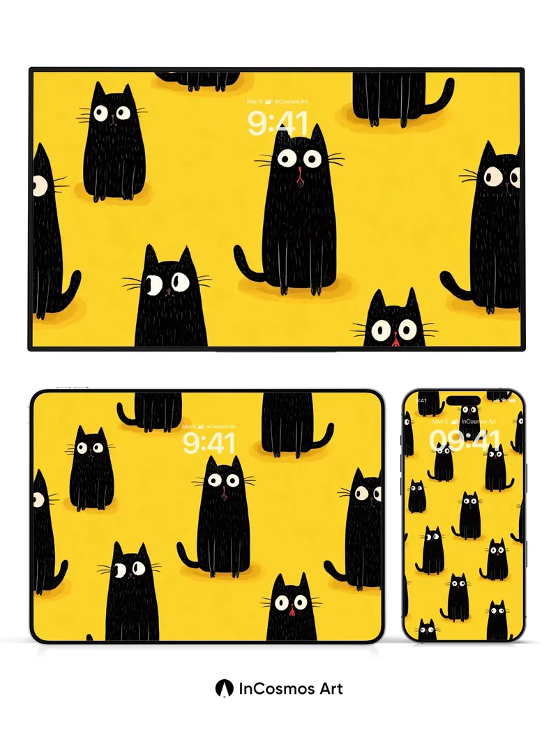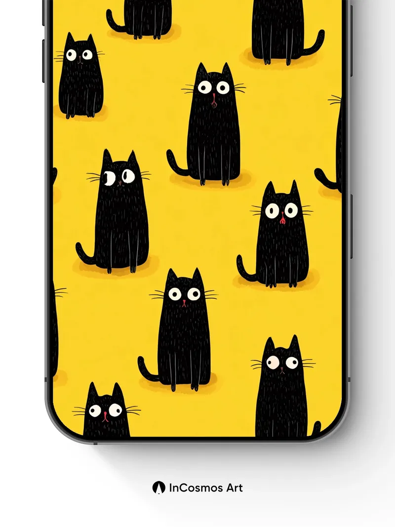 Did you know that cats have nearly 30 muscles in each ear, allowing them to rotate independently? Here, their wide-eyed curiosity dances across a sunlit yellow field, where every silhouette hums with quiet mischief. Their glossy black forms feel like velvet under a spotlight, each whisker drawn with delicate precision, as if they’re listening to secrets only the night knows.