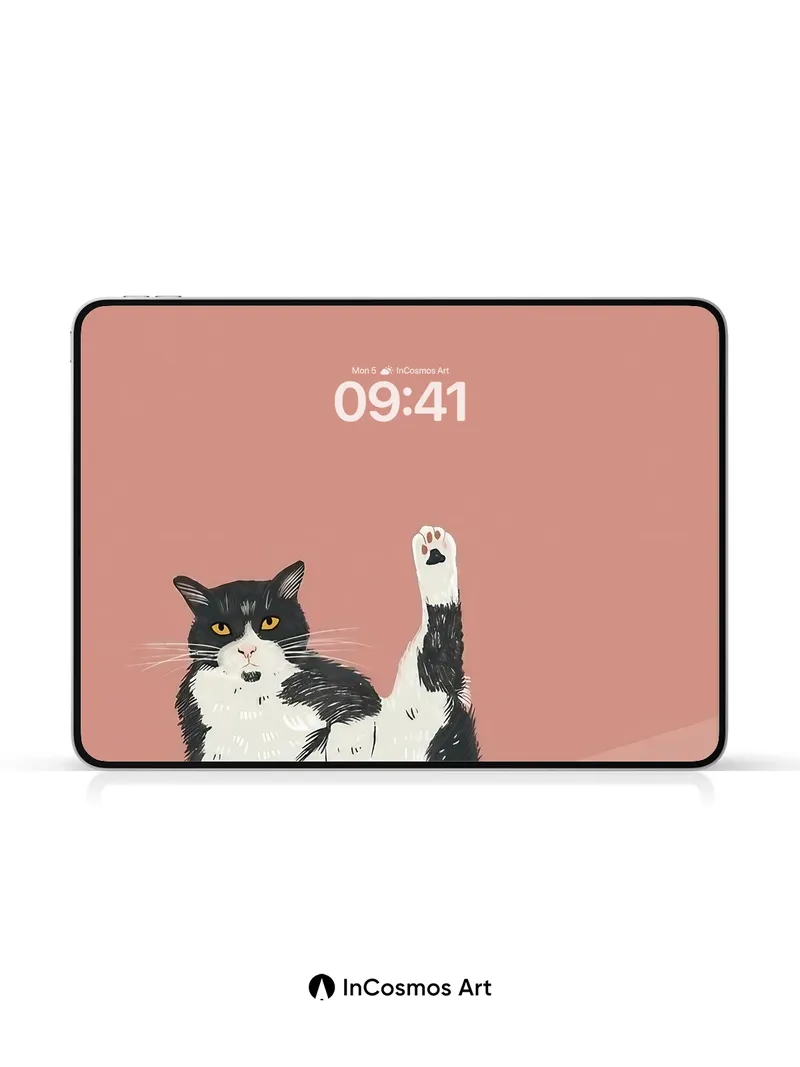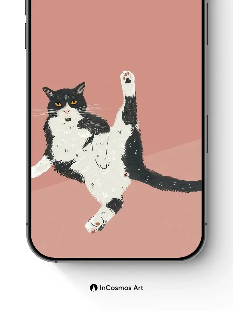 Debug product.metafields.custom.desc: Did you know cats can rotate their bodies mid-air to land on their feet, a skill honed by nature’s physics and instinct? This illustrated cat floats effortlessly against a warm terracotta backdrop, its paws outstretched like a dancer in silent motion. The soft contrast of black and white fur, paired with golden eyes, creates a moment suspended between gravity and whimsy.