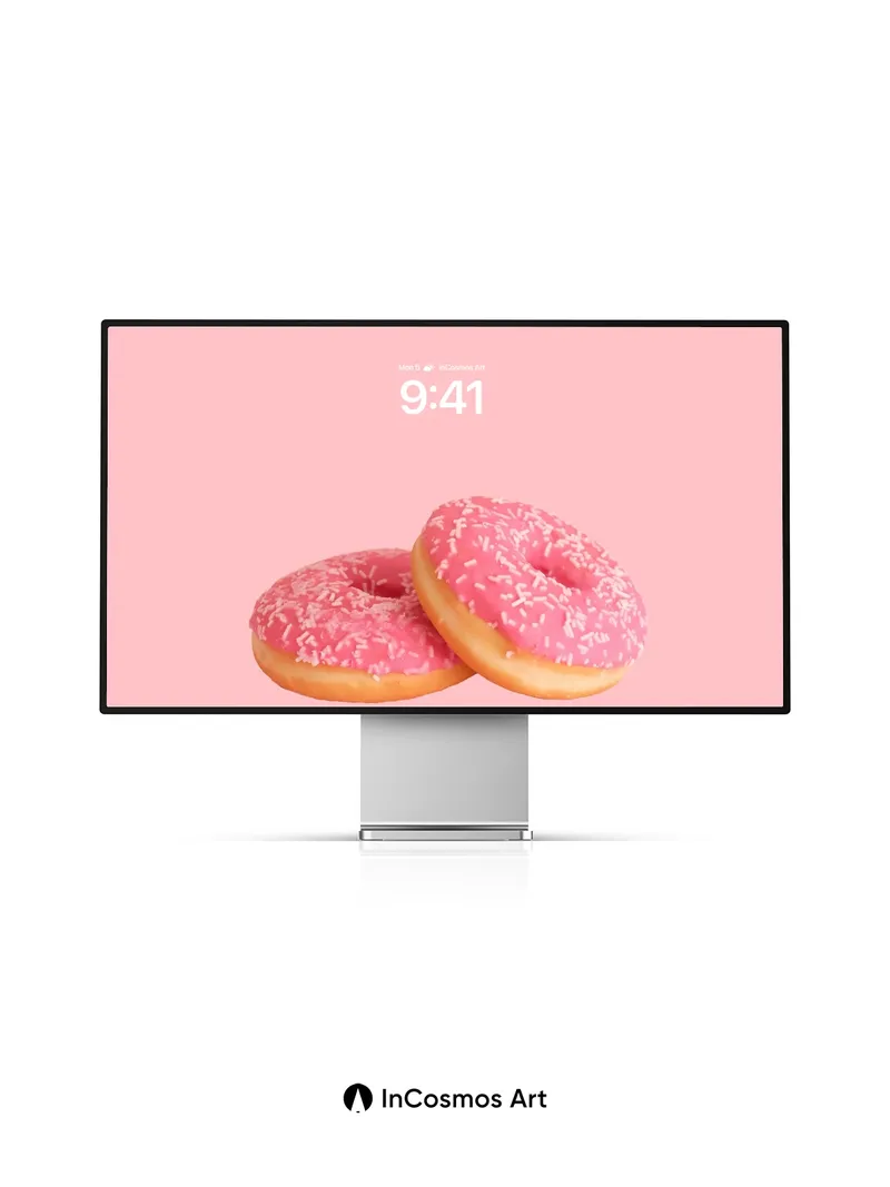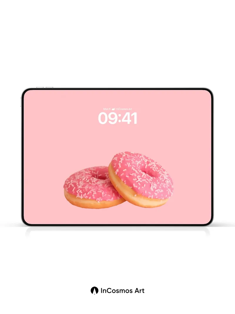 Debug page_description: Did you know sprinkles were originally invented to add texture to confections in 19th-century Europe? Here, they dance across glossy pink glaze like tiny sugar stars, each one catching the light as if breathing life into a pastel dream. The donuts rest gently against a soft coral void, their golden edges glowing with quiet warmth—inviting you to sink into sweetness without ever leaving your wall. Share this with your best friend. Send this to your love and swap a matching set. What if every morning began with a bite of color?