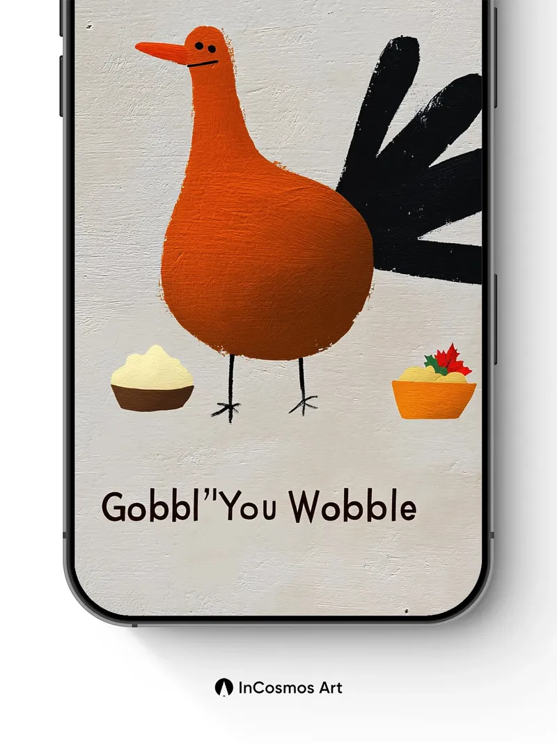 Debug page_description: Did you know turkeys have a third eyelid that sweeps across their eye like a silent curtain? This painted bird stands proud on textured canvas, its bold orange body glowing against a soft off-white backdrop, flanked by two tiny dishes—one of mashed potatoes, the other of cranberry sauce—each a miniature world of holiday warmth. The black tail feathers fan out like a dramatic flourish, while the phrase 'Gobbl’You Wobble' whispers mischief beneath. Share this with your best friend. Send this to your love and swap a matching set. What if every Thanksgiving dinner had a secret joke only the wallpaper knew?