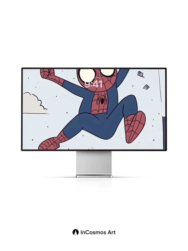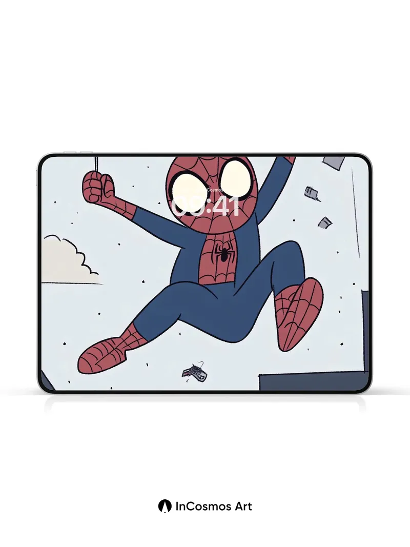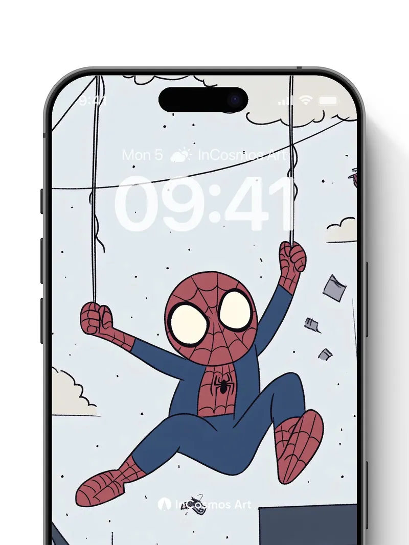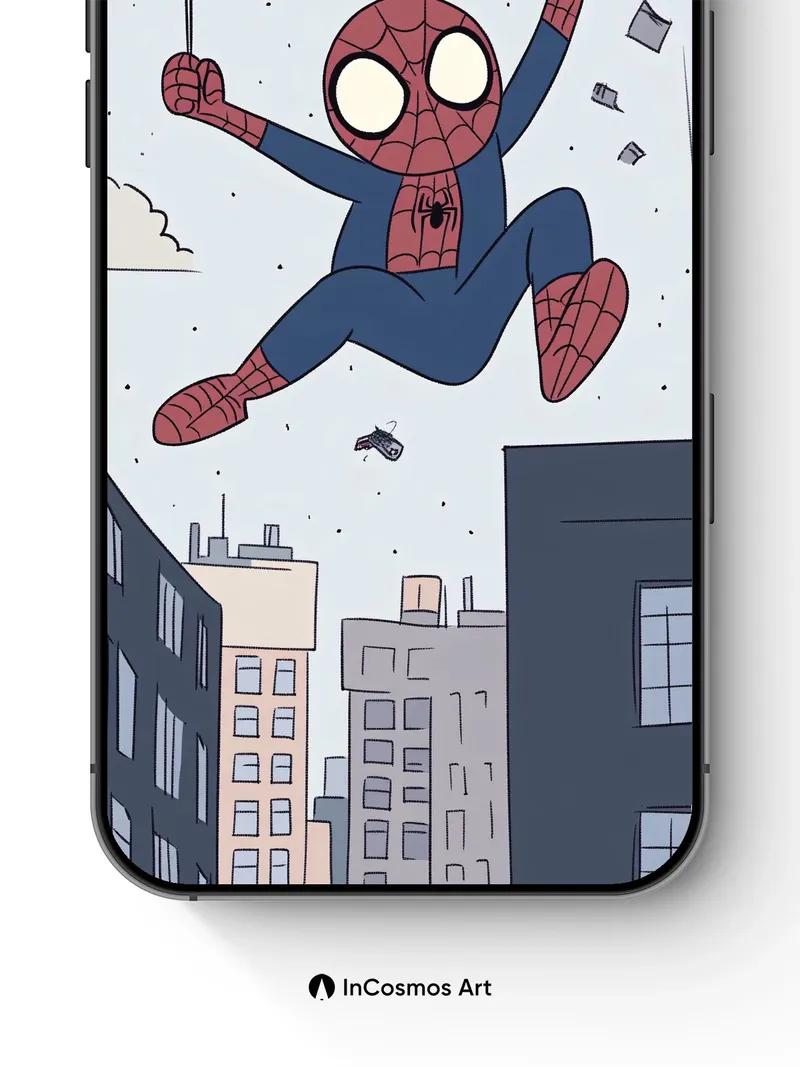 Debug page_description: Did you know Spider-Man’s web-shooters were inspired by a real-life silk-spinning spider? Here, he dangles mid-air, suspended between city rooftops, his red-and-blue suit glowing against a pale sky speckled with floating debris and clouds. The lines of his web stretch like threads of fate, catching light in soft glimmers as he swings with effortless joy. Below, the buildings rise in muted tones—beige, gray, navy—framing a moment of dynamic stillness, where gravity bends to whimsy and every swing feels like a secret dance with the wind. Share this with your best friend. Send this to your love and swap a matching set. What if every swing left a trail of tiny stars?