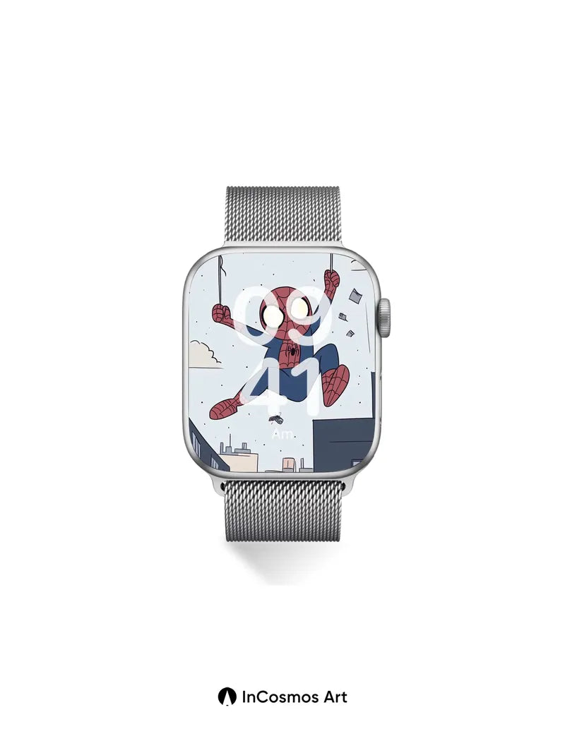 Debug product.metafields.custom.desc: Did you know Spider-Man’s web-shooters were inspired by a real-life silk-spinning spider? Here, he dangles mid-air, suspended between city rooftops, his red-and-blue suit glowing against a pale sky speckled with floating debris and clouds. The lines of his web stretch like threads of fate, catching light in soft glimmers as he swings with effortless joy. Below, the buildings rise in muted tones—beige, gray, navy—framing a moment of dynamic stillness, where gravity bends to whimsy and every swing feels like a secret dance with the wind.