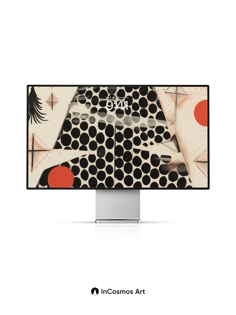Debug product.metafields.custom.desc: Did you know that the repetition of dots in art can mimic neural patterns in the brain? Here, black spheres pulse across a triangular tree like stars in a quiet cosmos, while coral waves ripple above like ancient topography. The surface breathes—each dot a tiny mirror reflecting light as if it were alive, and the red circles glow like distant lanterns in a dream forest.