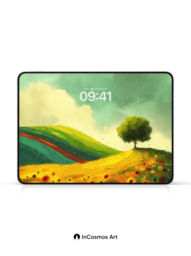 Rain-Kissed Meadow Wallpaper with Solitary Tree