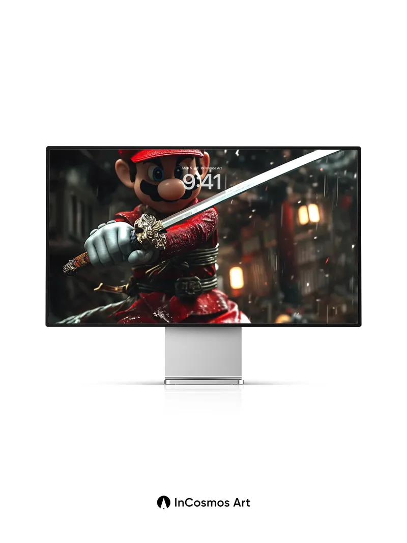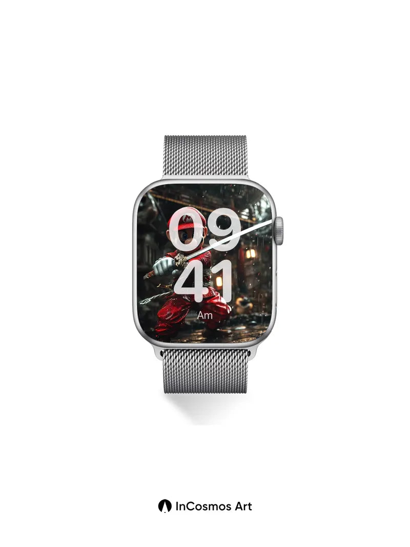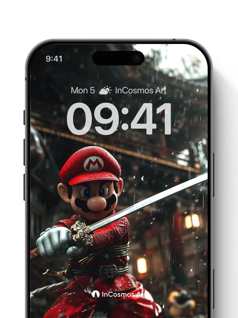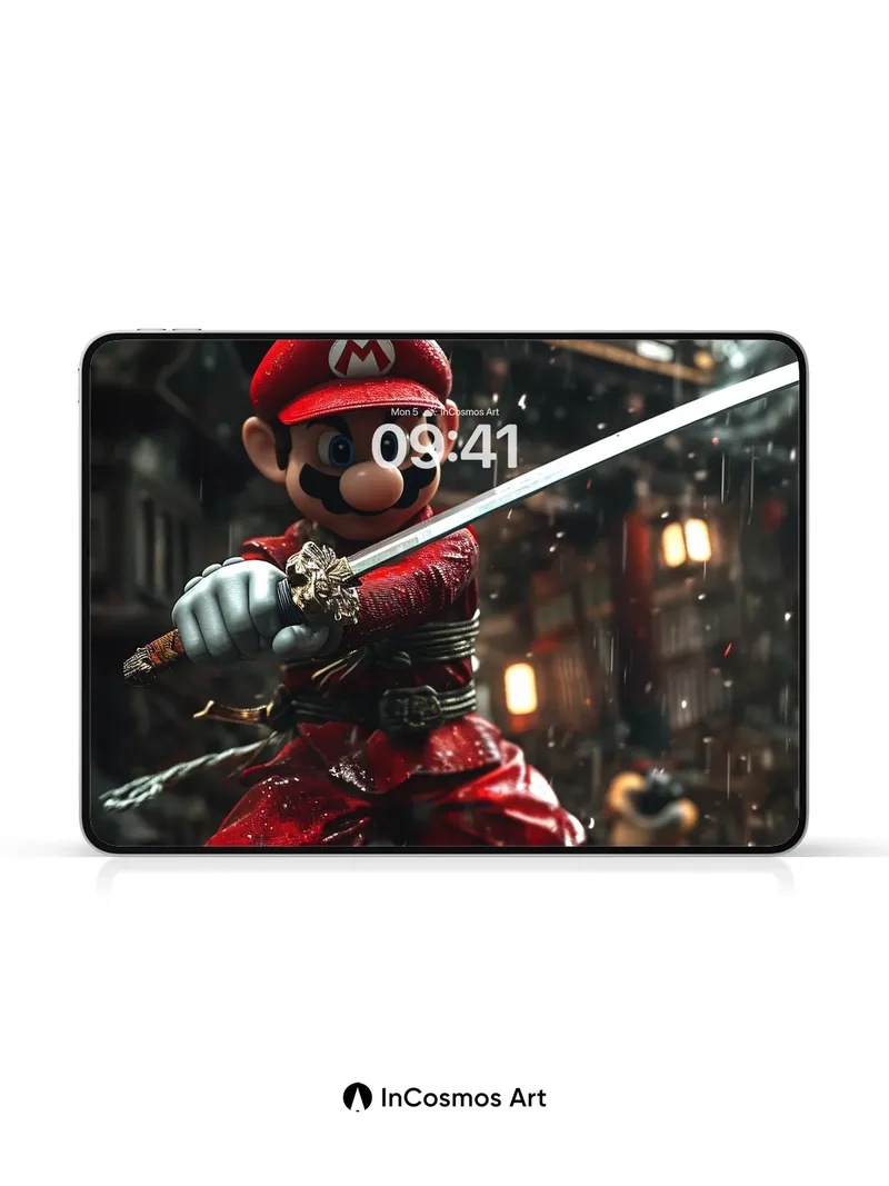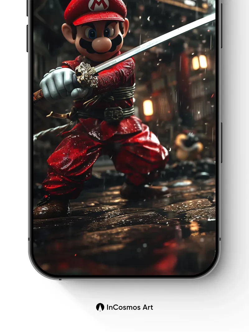 Debug product.metafields.custom.desc: Did you know that traditional Japanese swordsmiths once tempered blades in rainwater to achieve perfect hardness? Here, Mario stands poised beneath a storm, his red fabric glistening like wet silk under flickering lantern light, the steel of his katana catching every droplet like liquid silver. The rain doesn’t fall—it dances across the wooden planks, reflecting the firelight and shadows of an ancient shrine, turning each puddle into a mirror of myth.