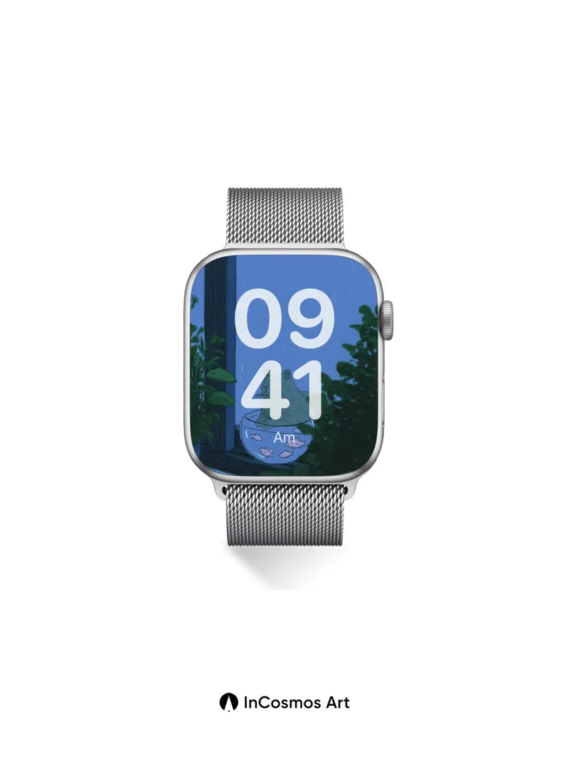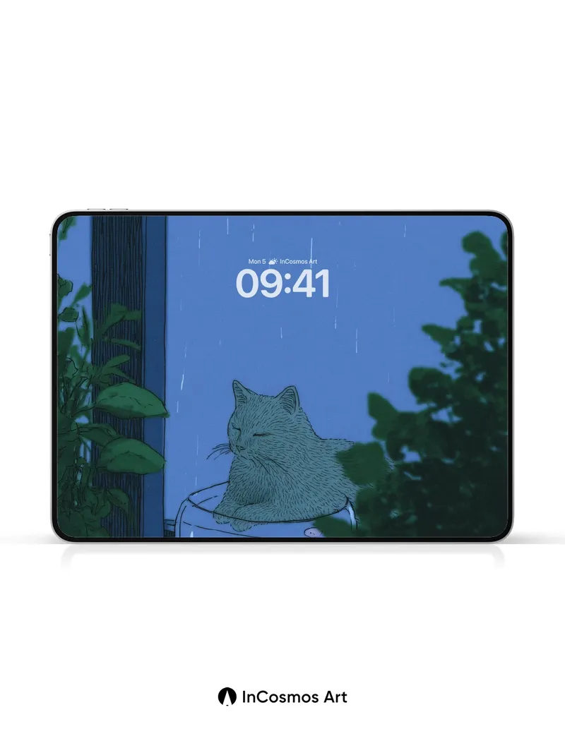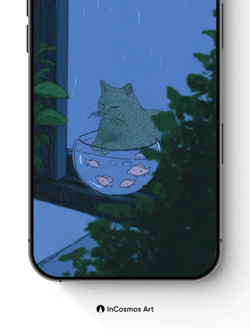 Rain-Slicked Serenity Wallpaper with Feline Fishbowl