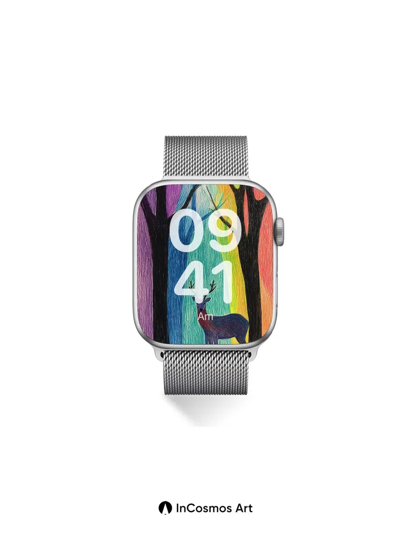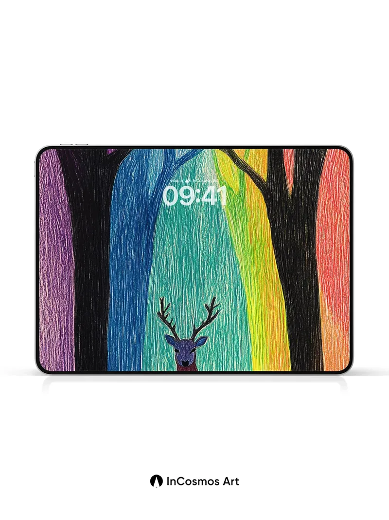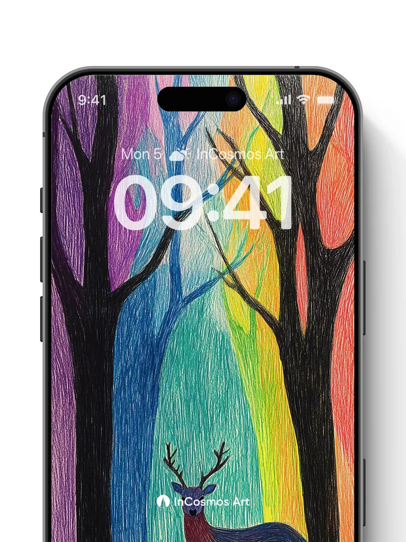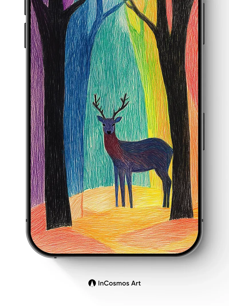 Debug product.metafields.custom.desc: Did you know that in some ancient cultures, deer were believed to carry messages from the spirit world? Here, a majestic stag stands between towering trees whose bark hums with dark energy, while behind it, light spills like liquid prism through the canopy—each hue breathing life into the forest floor. The colors don’t just surround him; they vibrate around his stillness, as if time itself paused to listen.