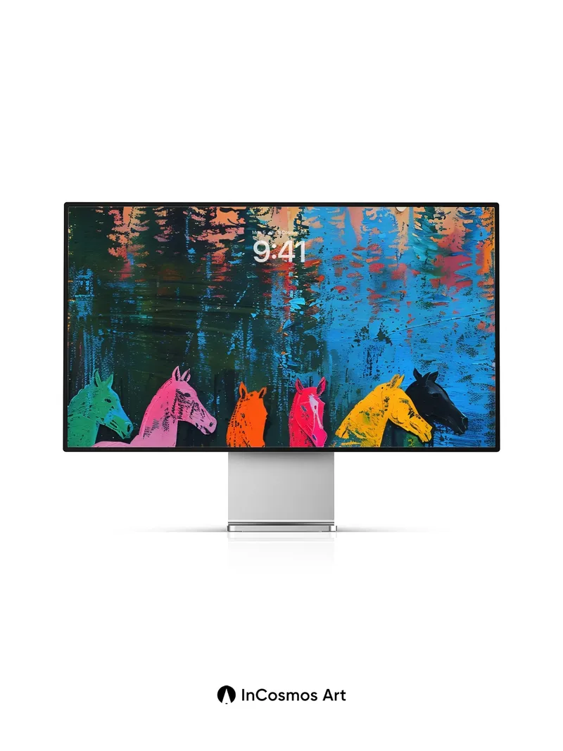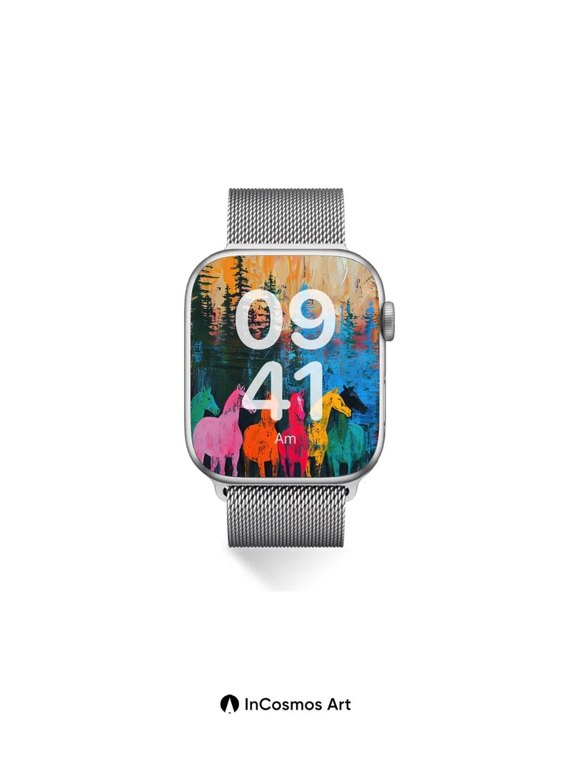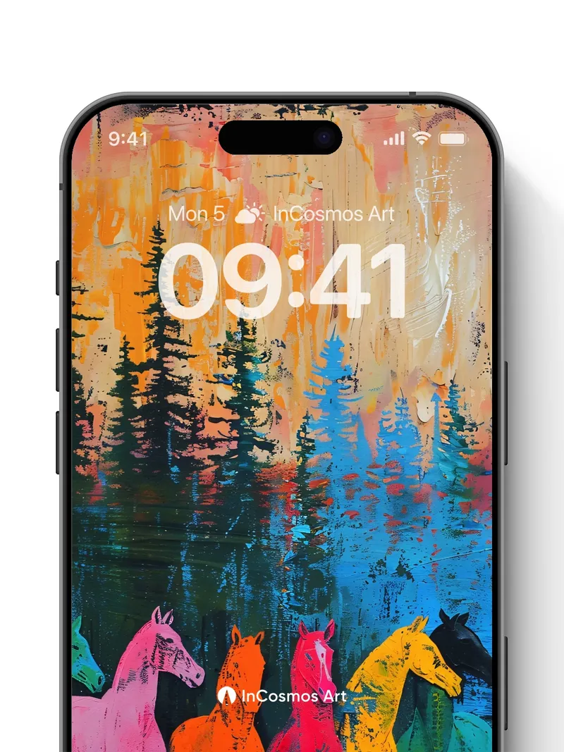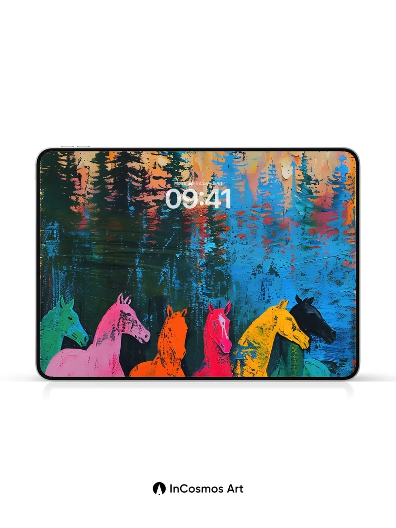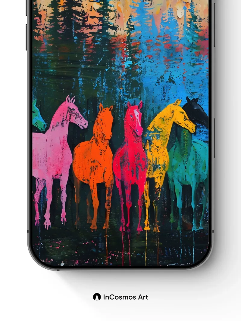 Debug product.metafields.custom.desc: Did you know that horses in ancient cave paintings were often rendered in vivid ochre and charcoal, symbolizing spiritual power? Here, five spectral steeds stand in a forest of neon silhouettes, their bodies painted in electric hues that bleed into the dark like liquid light. The trees above mirror the sky’s molten glow—amber, rose, and violet streaks cascading over pine forms reflected in a lake of deep cobalt. This is not just a scene; it's a ritual of color where nature and myth collide.