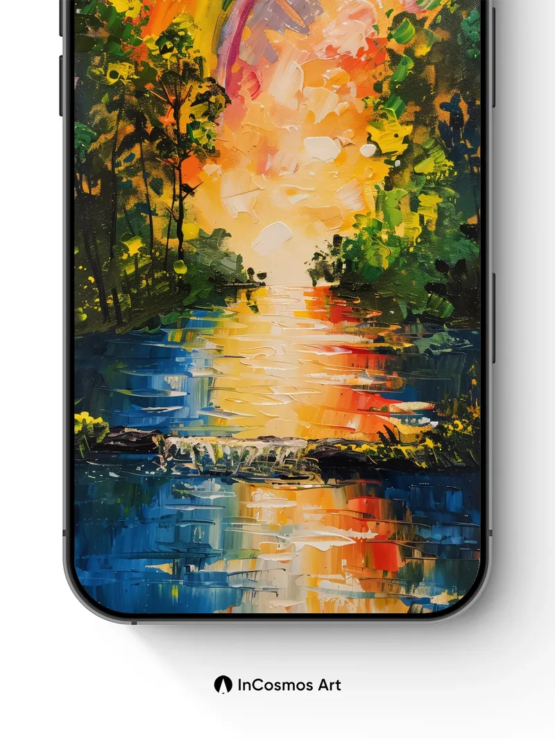 Debug product.metafields.custom.desc: Did you know that rainbows form when sunlight refracts through water droplets, creating a spectrum of colors that dance across the sky? In this painting, light crawls over thick impasto strokes, bending into a luminous arc above a still river where every hue breathes in mirrored silence. The trees stand like sentinels, their leaves shimmering with gold and emerald, as if touched by dawn’s first whisper.