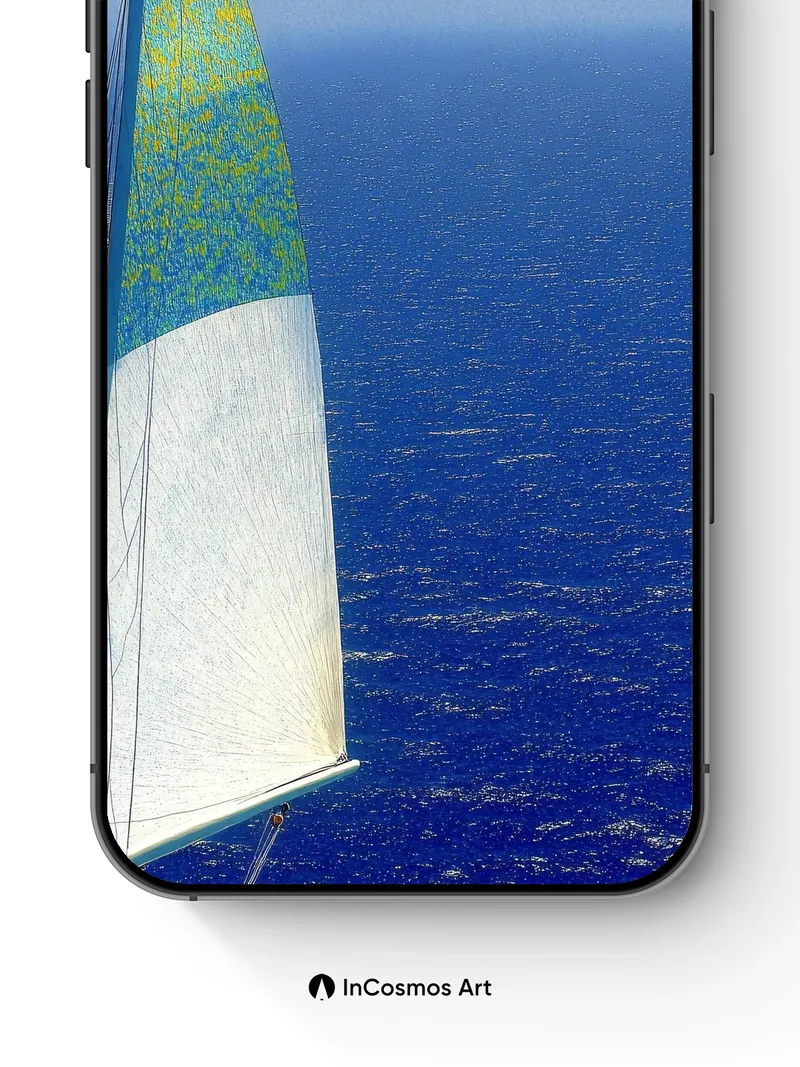Did you know the sails of old oceanic vessels were once treated with whale oil to withstand salt and wind? Here, light crawls over the textured weave of a taut sail, where turquoise and gold blend like liquid pigment against an endless blue horizon. The sea below breathes in rhythm with the sky, each wave a whisper of motion beneath a canvas of cloud-streaked clarity.