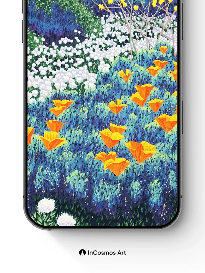 Debug product.metafields.custom.desc: Did you know that poppies once grew in ancient Mesopotamian fields where they were believed to be gifts from the gods? Here, their orange crowns rise like lanterns above a sea of sapphire and silver-green, each petal edged in light as if breathing. The garden doesn’t just bloom—it pulses with quiet energy, its colors layered like stained glass under an unseen sun.