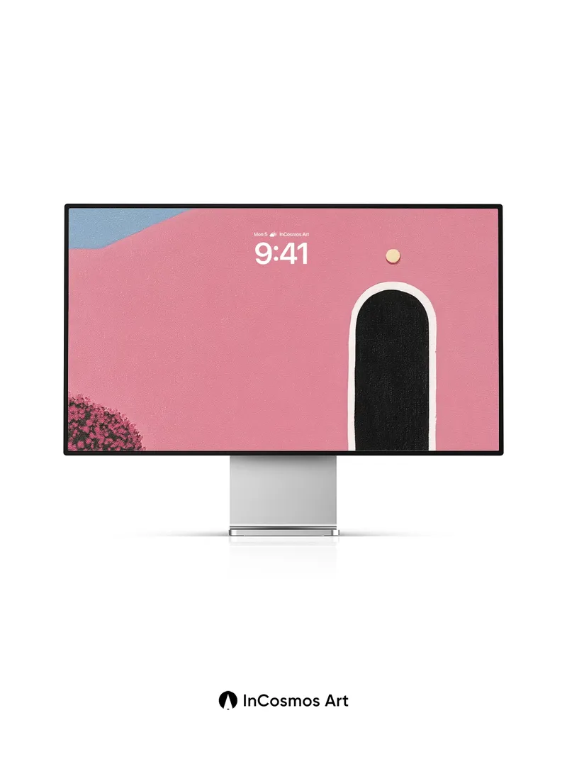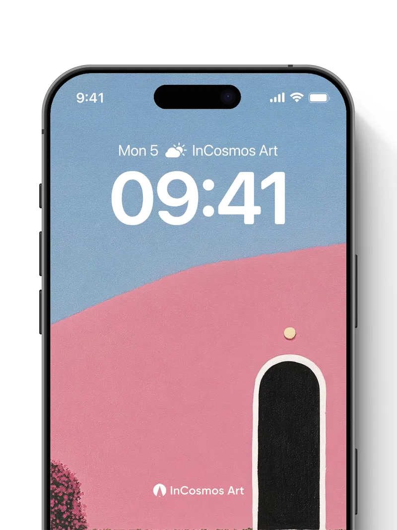 Debug product.metafields.custom.desc: Did you know the color pink was once used in ancient Rome to calm aggressive behavior? Here, a soft blush hillside rises like a breath held in stillness, framing a stark black arch that swallows light. The path ahead glows faintly, as if paved with moonlight, while a single golden dot hovers above—silent and unblinking. You stand at the threshold of nowhere and everywhere, where silence hums louder than sound.