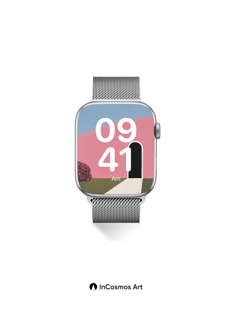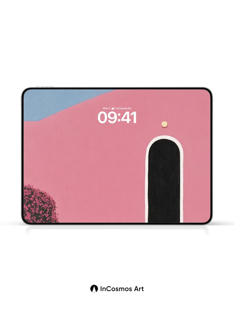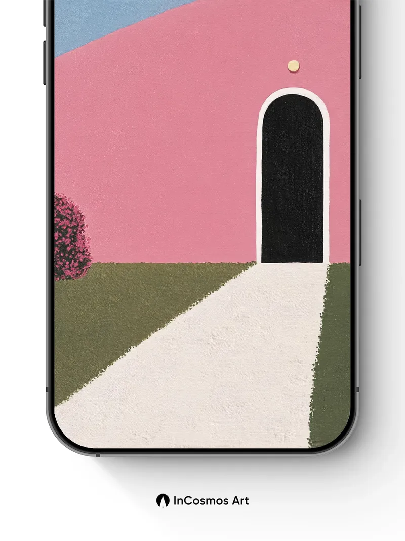 Debug page_description: Did you know the color pink was once used in ancient Rome to calm aggressive behavior? Here, a soft blush hillside rises like a breath held in stillness, framing a stark black arch that swallows light. The path ahead glows faintly, as if paved with moonlight, while a single golden dot hovers above—silent and unblinking. You stand at the threshold of nowhere and everywhere, where silence hums louder than sound. Share this with your best friend. Send this to your love and swap a matching set. What lies beyond the door that never opens?