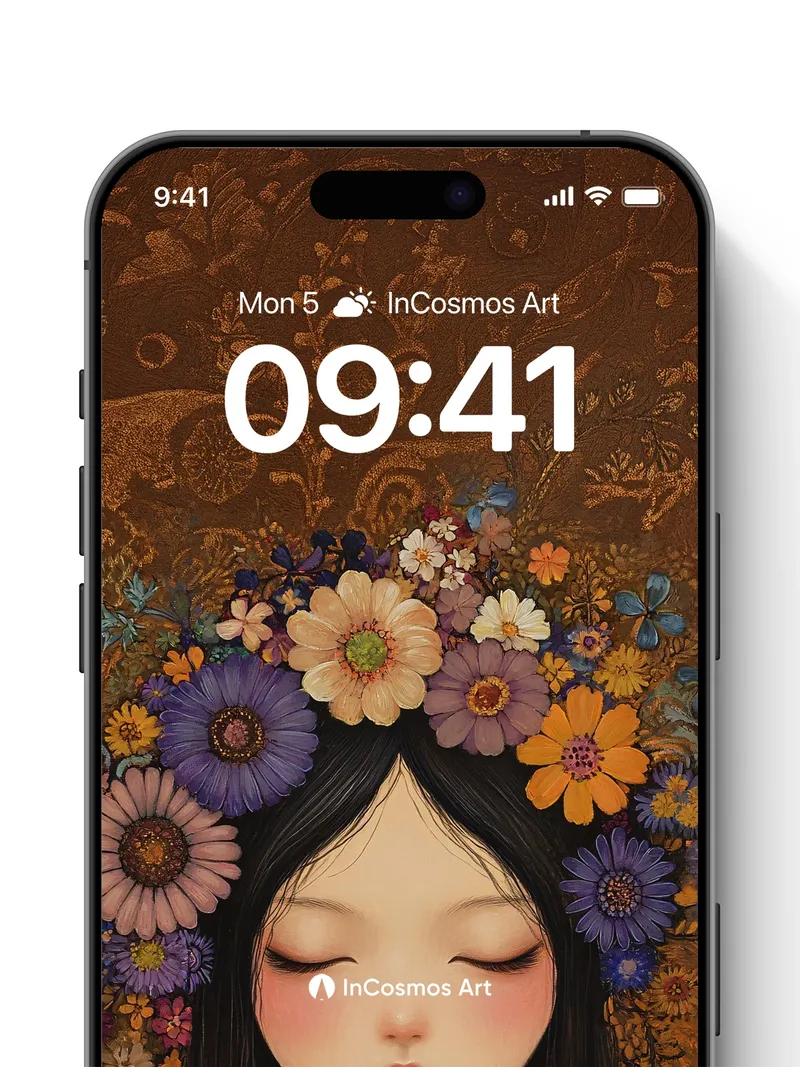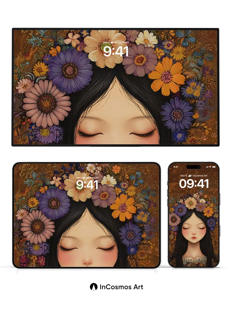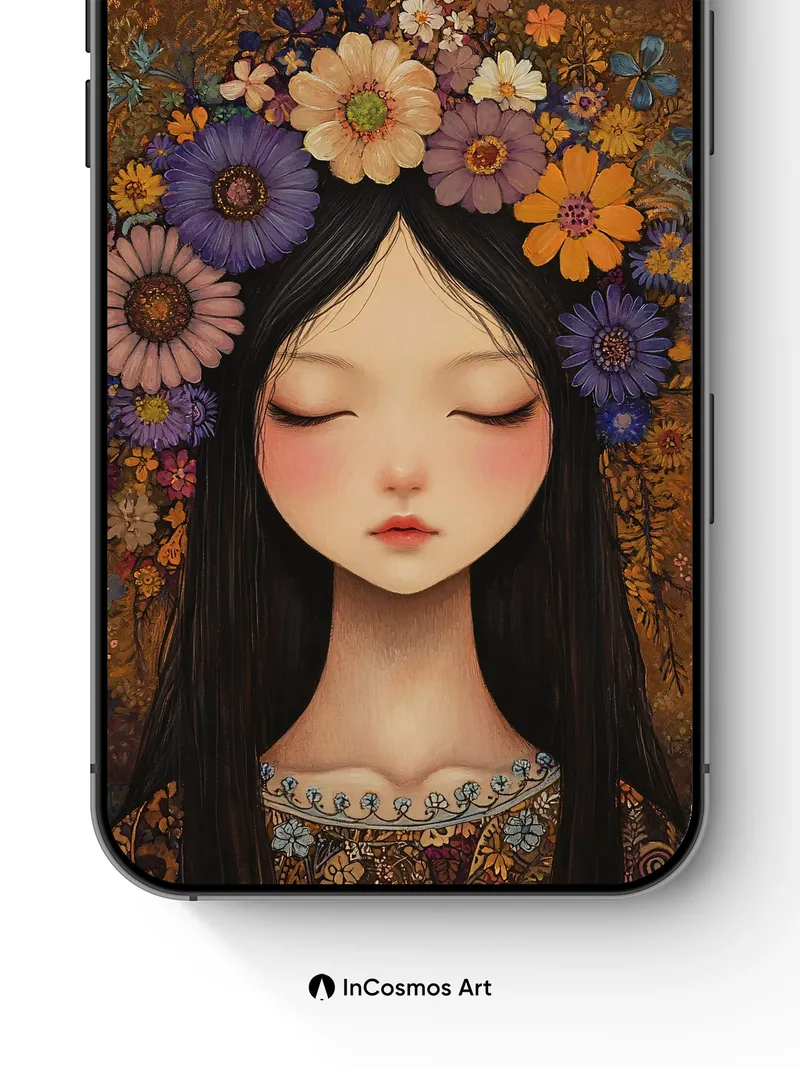 Debug product.metafields.custom.desc: Did you know that in ancient cultures, flower crowns were worn to channel nature’s quiet wisdom? Here, a tapestry of daisies, cosmos, and wild blooms cradles a still face, where light breathes softly over velvety petals and ink-black hair like midnight silk. The background hums with golden filigree—etched patterns that whisper of forgotten myths, while the girl’s closed eyes hold the silence of dawn.