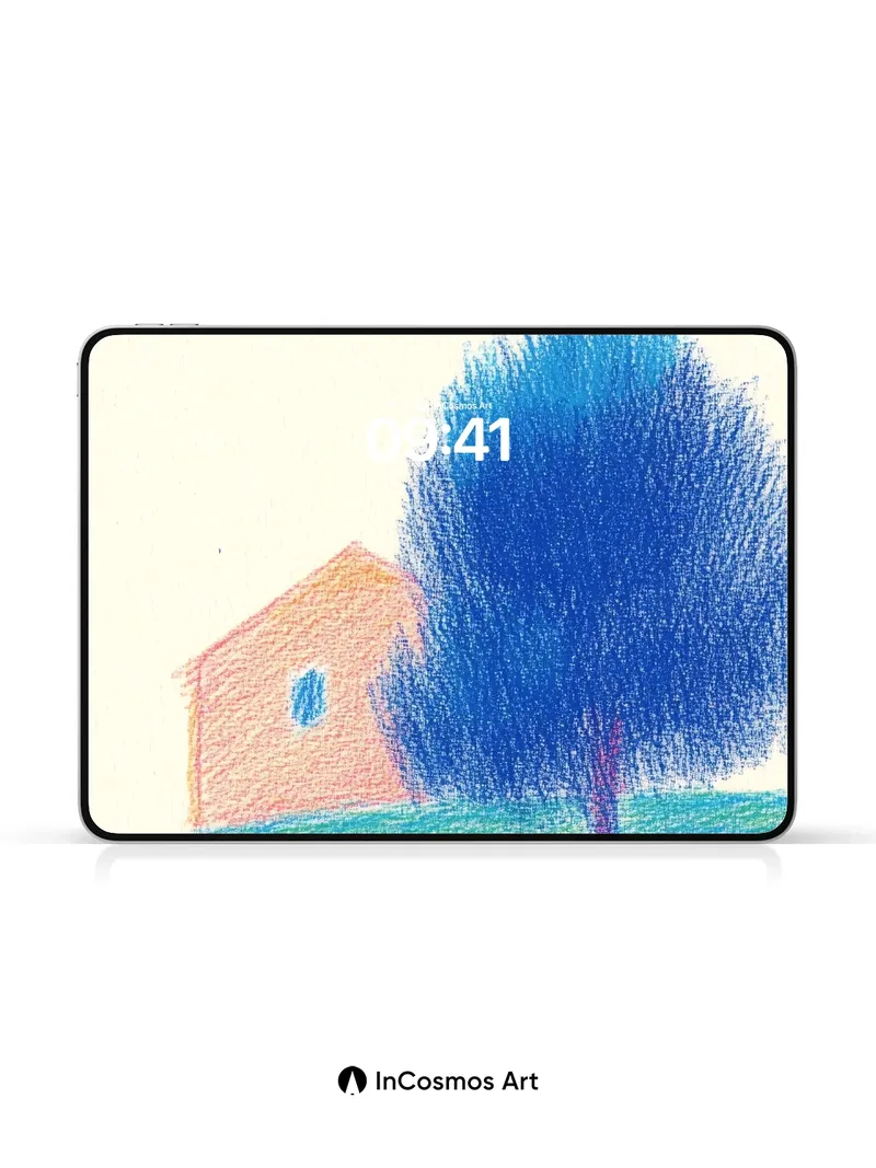 Serene Blue Tree Wallpaper with Soft Orange Hut