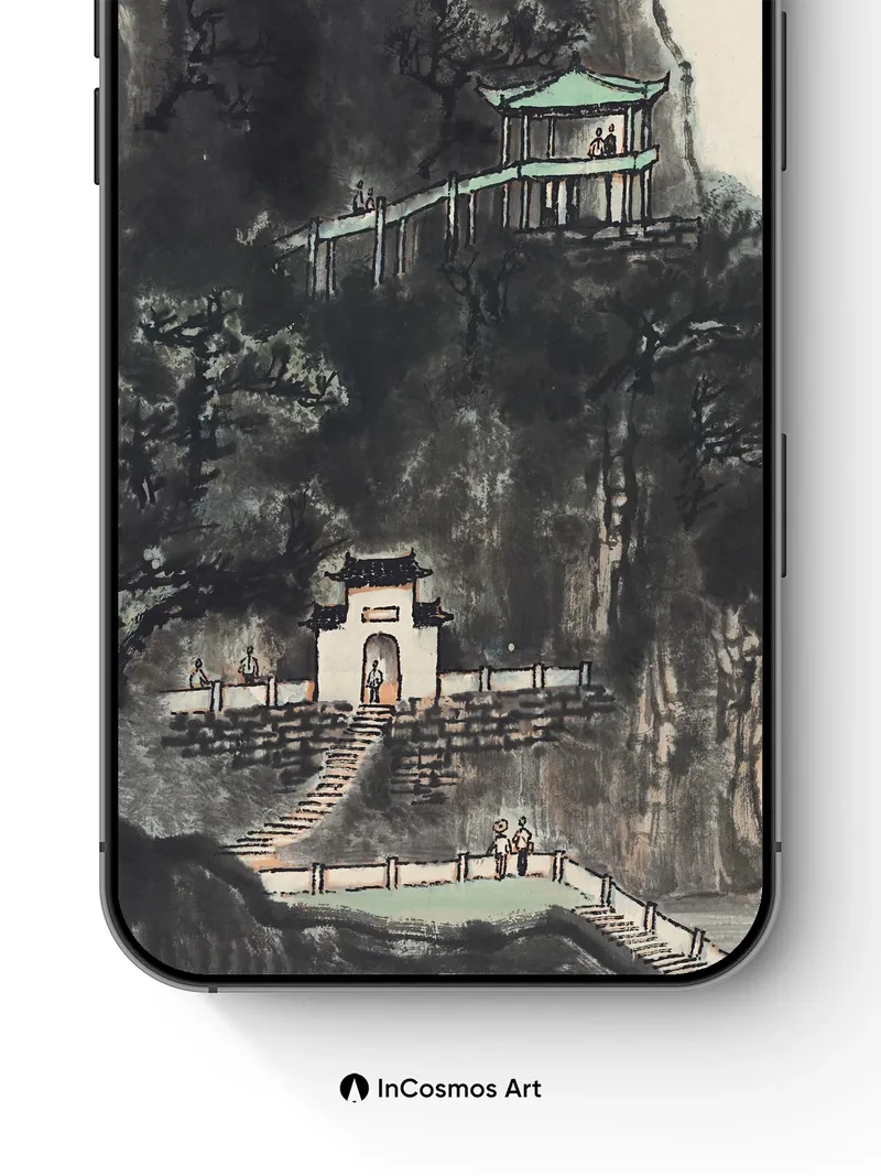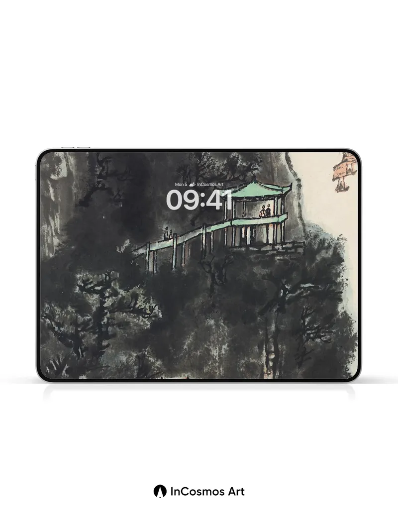 Serene Cliffside Pavilion Wallpaper with Inked Depths