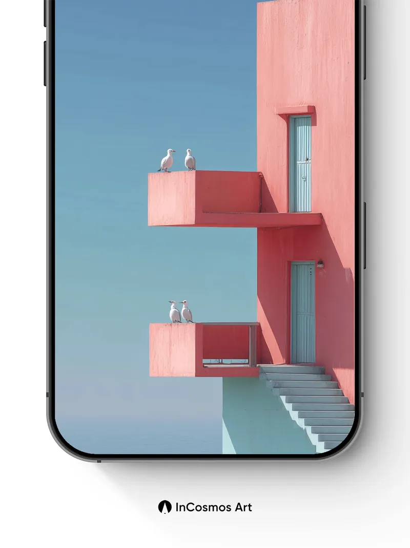 Serene Coral Balcony Wallpaper with Seagull Silhouettes