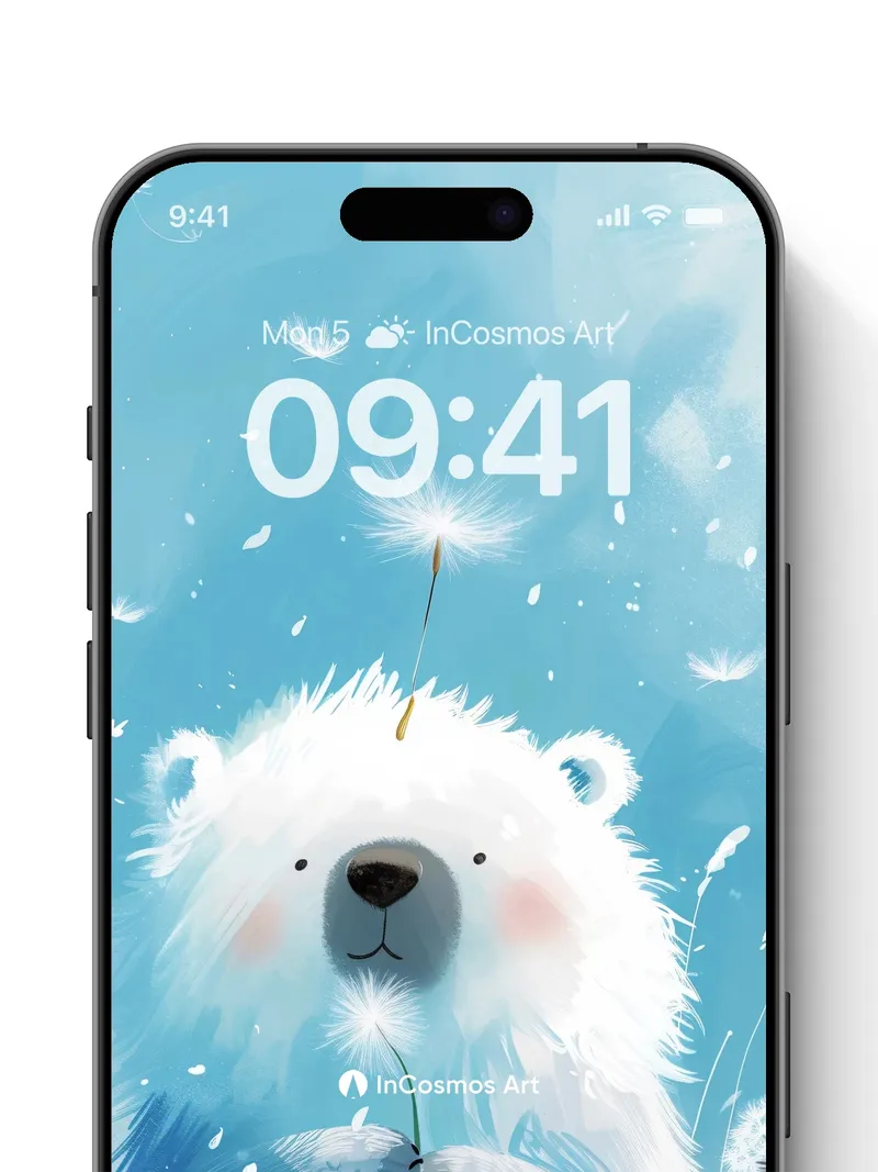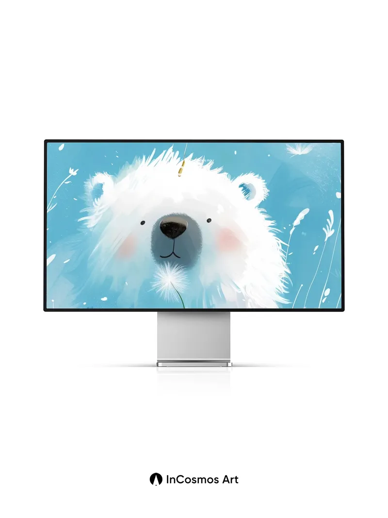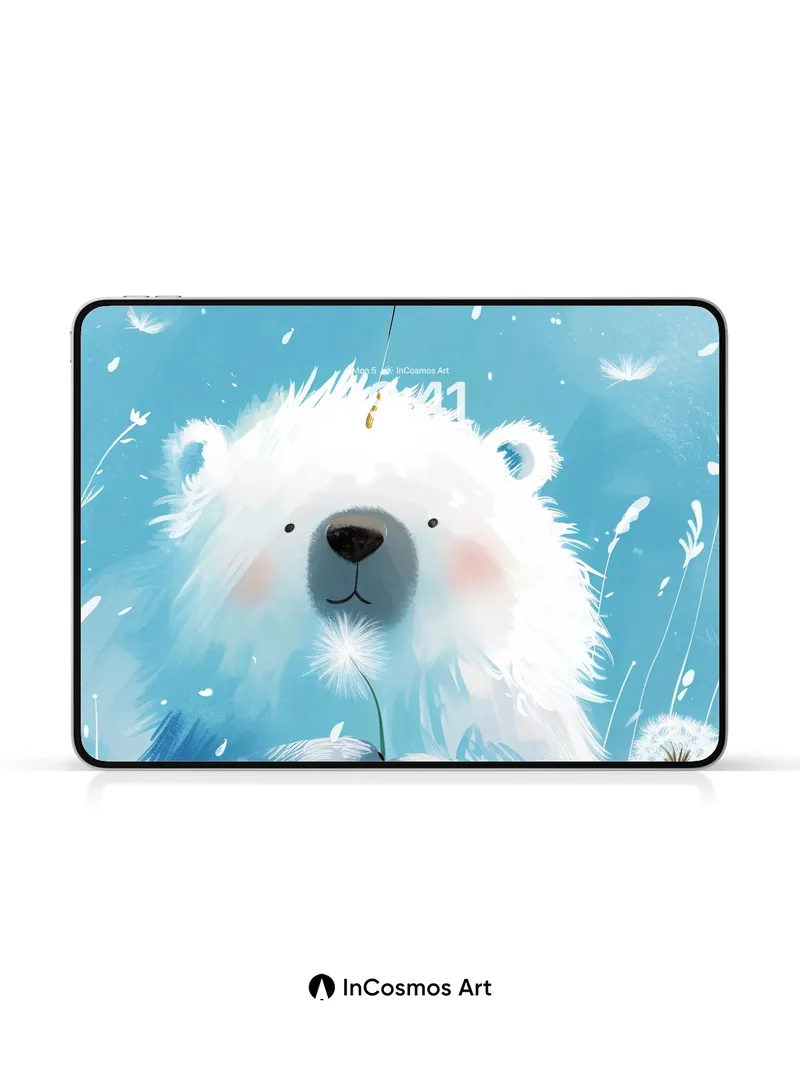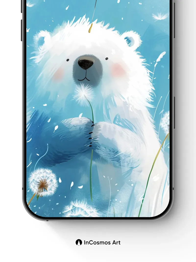 Debug product.metafields.custom.desc: Did you know dandelion seeds can travel up to five miles on a single breeze? Here, they float like snowflakes through a sky of soft azure, brushing past the fluff of a polar bear’s fur that seems to breathe with each passing gust. The bear holds a stem gently, its eyes closed in quiet contemplation, as if listening to the wind’s secret lullaby—its white coat blending into the dreamlike haze, where nature and stillness meet in perfect harmony.