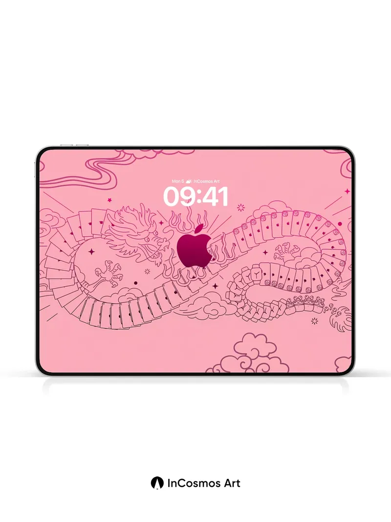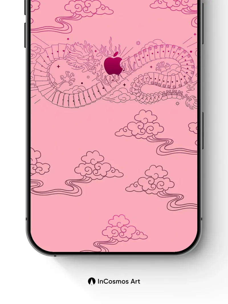 Debug page_description: Did you know ancient Chinese artisans believed dragons could control the weather, breathing life into clouds and storms? Here, a delicate pink dragon coils through misty skies, its body woven from intricate patterns and crowned with a bold, dark apple—like a myth reborn in digital form. The soft lines breathe warmth, while the contrast of the fruit hints at forbidden knowledge hidden in tradition. Share this with your best friend. Send this to your love and swap a matching set. What if every cloud held a secret waiting to be bitten?
