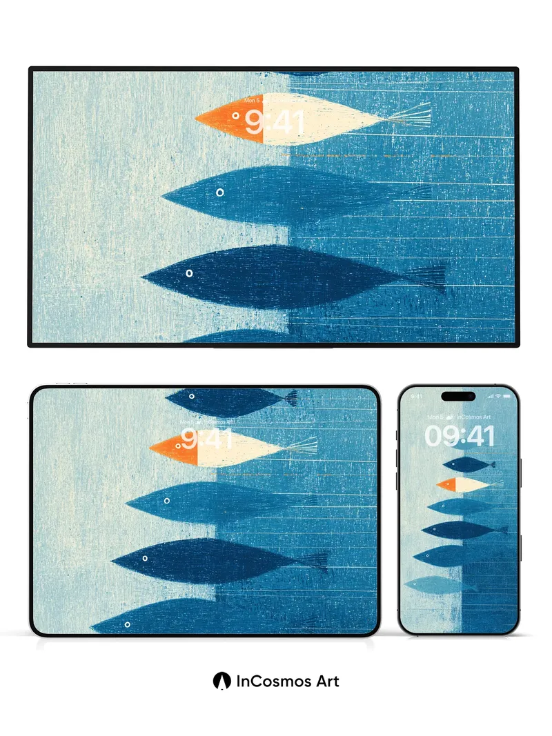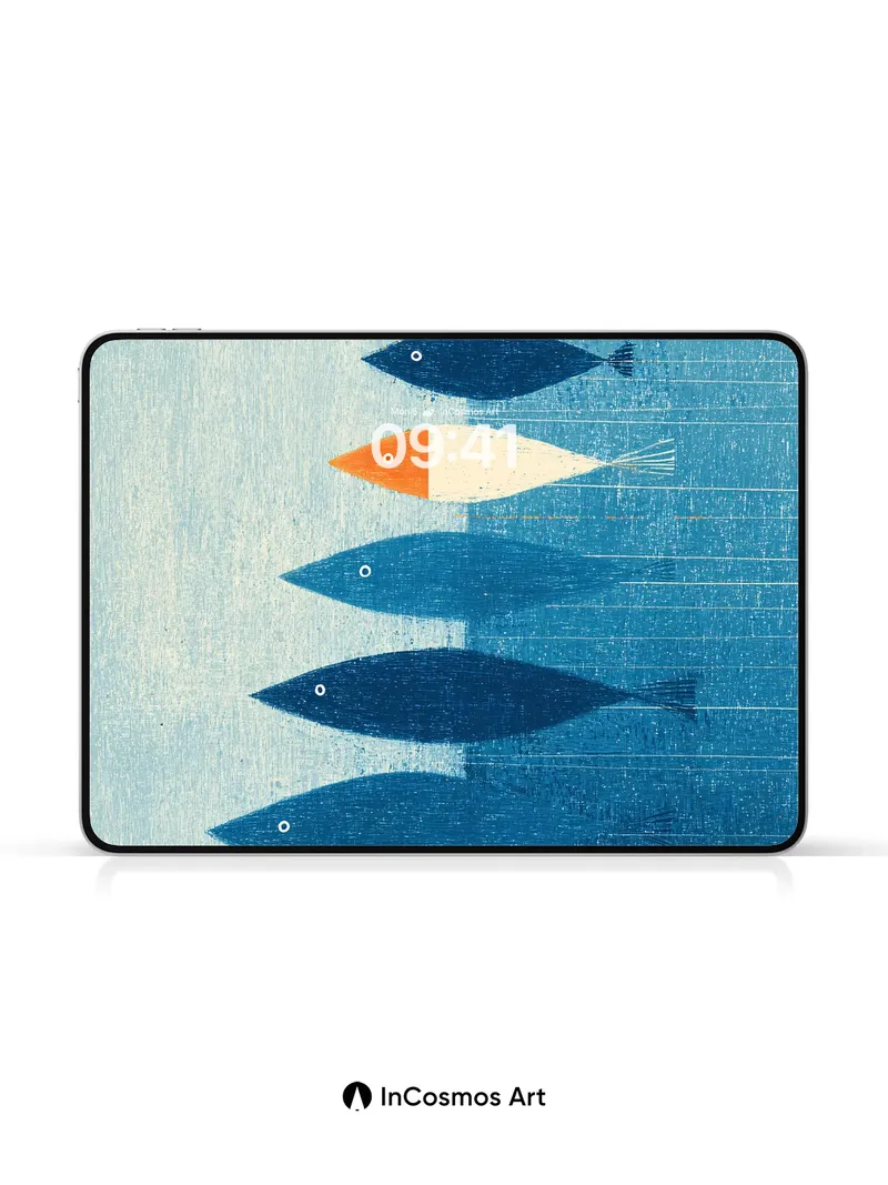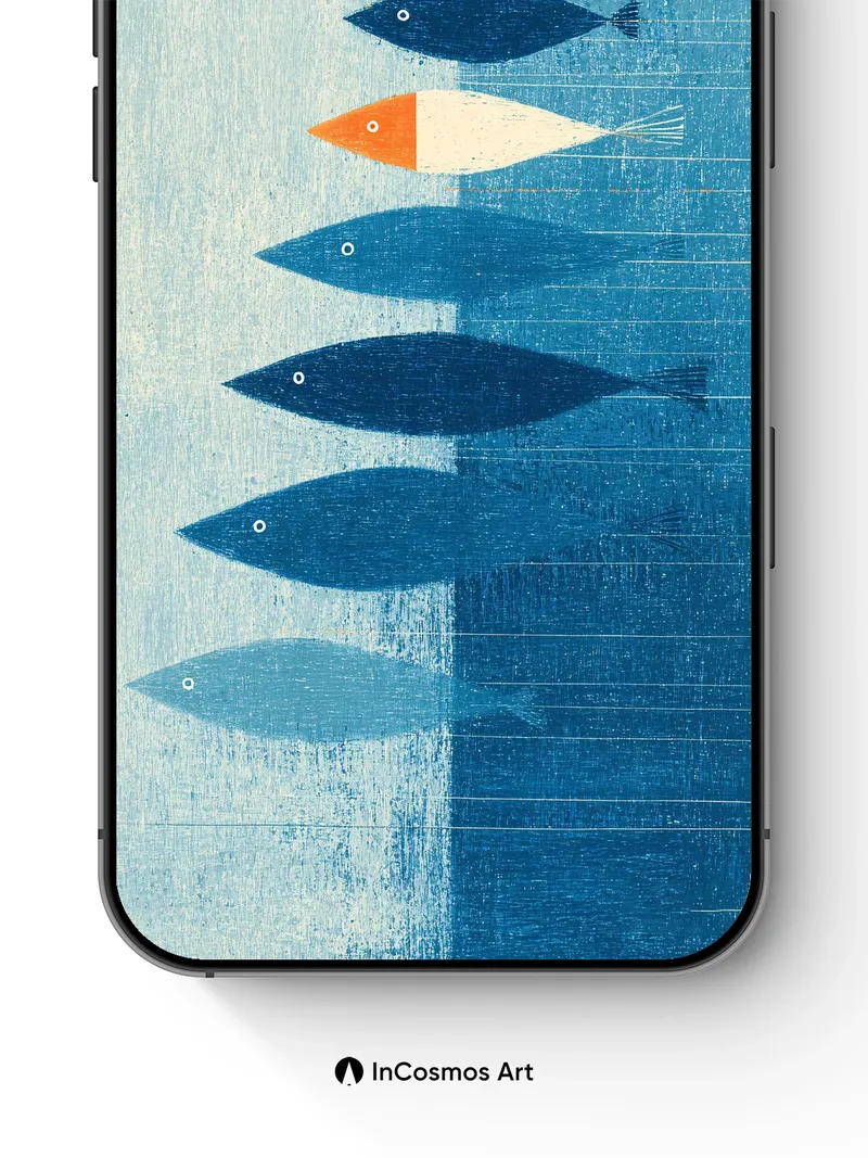 Debug page_description: Did you know that some fish species swim in perfect synchrony, their movements echoing ancient currents? Here, six stylized fish glide through a textured ocean of layered blues, each form a quiet pulse in the water’s breath. The surface hums with subtle grain, like linen soaked in twilight, while one orange-and-cream fish breaks the monotony—its tail fanning like a whisper of rebellion. Share this with your best friend. Send this to your love and swap a matching set. What if silence could swim?