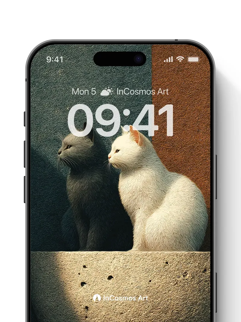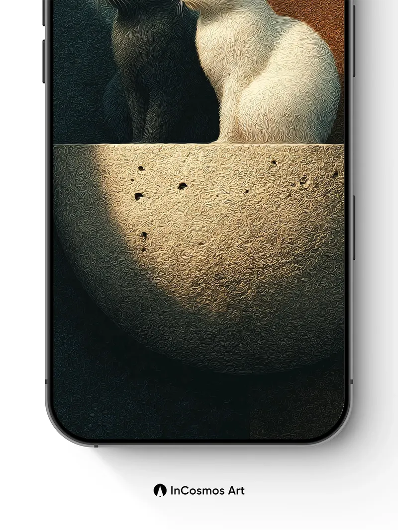 Did you know ancient Egyptians believed cats were sacred guardians of the soul? Here, two feline silhouettes sit in quiet communion atop a half-sphere of textured stone, their fur catching light like spun silk and shadow. The contrast between dark and white is not just color, but a whisper of balance—your gaze drawn to the way sunlight carves soft ridges into their coats, as if time itself paused to honor stillness.