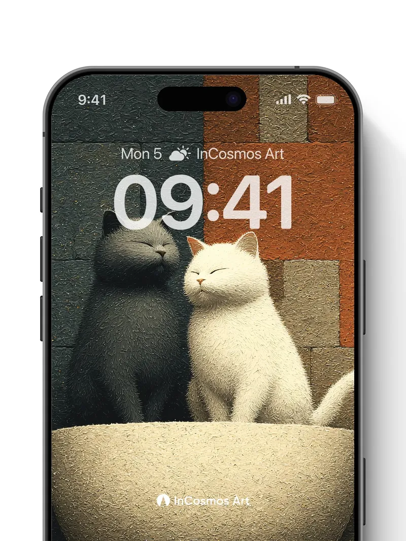 Debug page_description: Did you know that cats can sense changes in barometric pressure before storms? Here, two felines rest in a half-sphere of rough-hewn stone, their fur like soft ash and cloud against the geometric warmth of terracotta and slate. Light crawls over their forms, casting long shadows that whisper of quiet companionship, while the wall behind them breathes in muted earth tones—each tile a memory etched in time. Share this with your best friend. Send this to your love and swap a matching set. What if silence had a color?