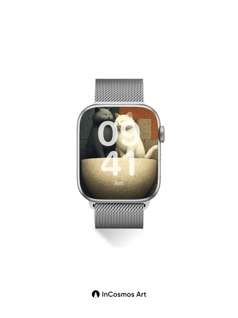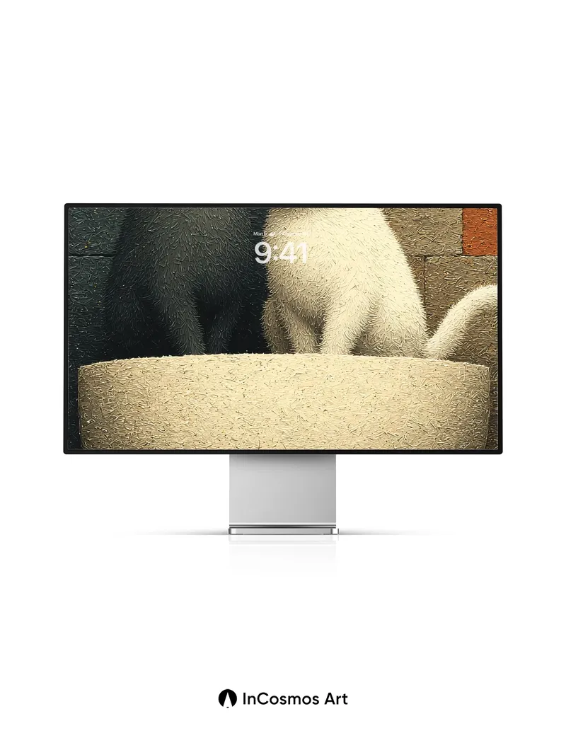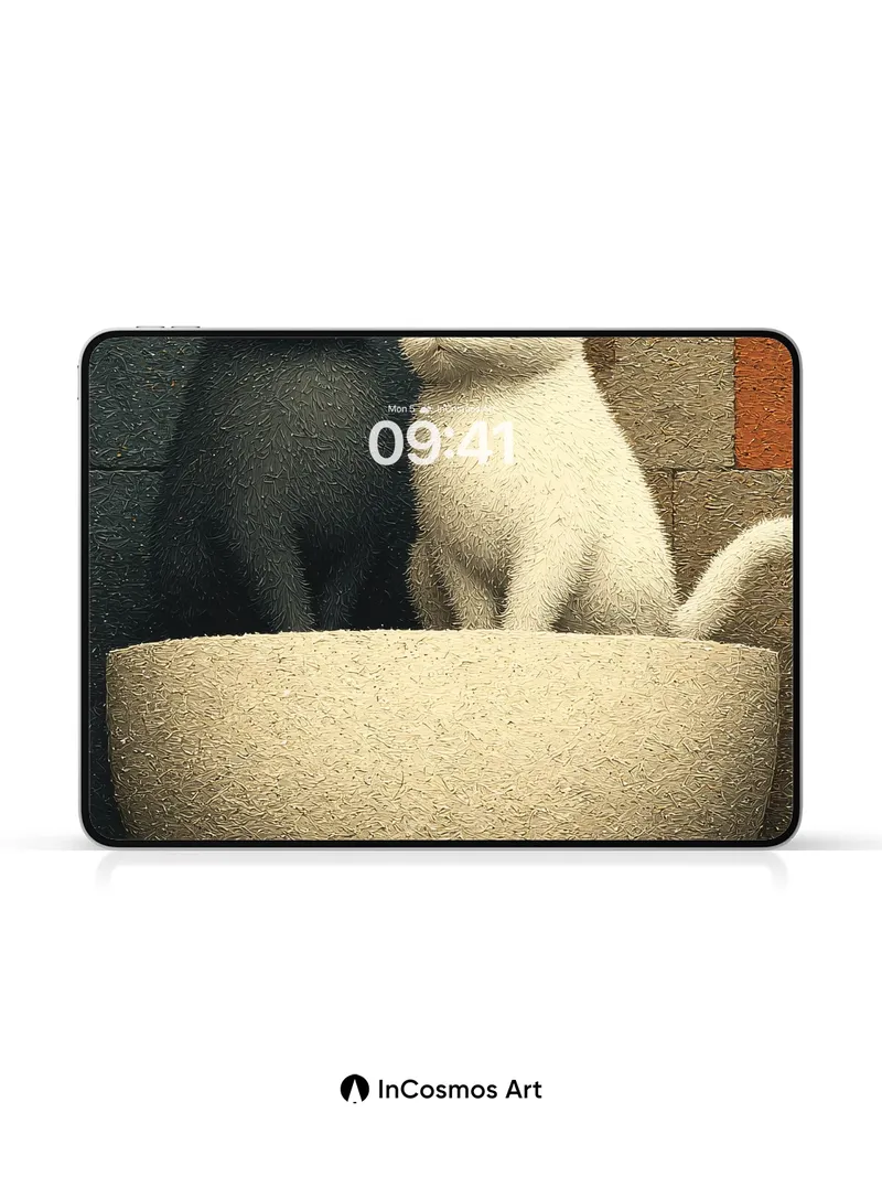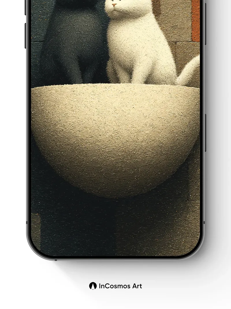 Debug product.metafields.custom.desc: Did you know that cats can sense changes in barometric pressure before storms? Here, two felines rest in a half-sphere of rough-hewn stone, their fur like soft ash and cloud against the geometric warmth of terracotta and slate. Light crawls over their forms, casting long shadows that whisper of quiet companionship, while the wall behind them breathes in muted earth tones—each tile a memory etched in time.