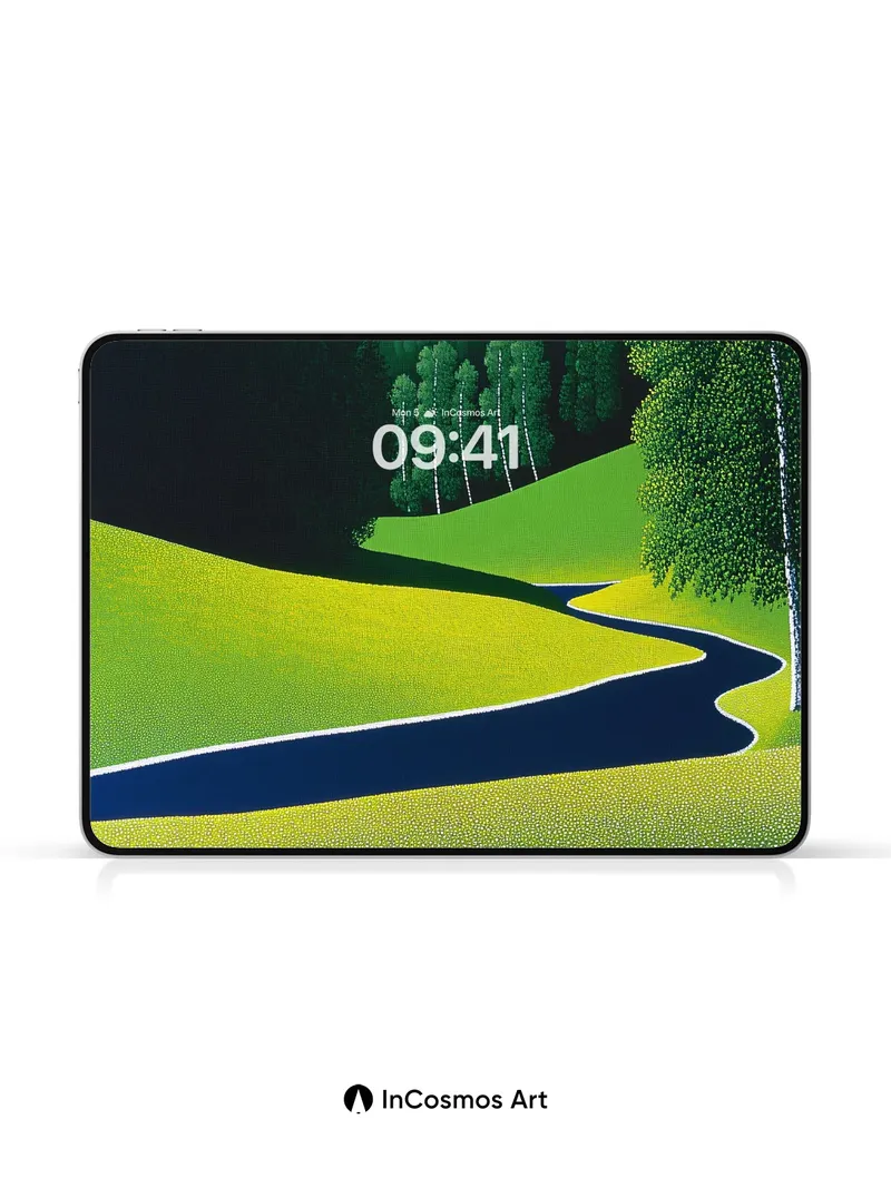 Debug page_description: Did you know the first known wallpaper was made from rice paper in 17th-century Japan? Here, a winding river cuts through emerald hills like liquid shadow, while dappled sunlight dances over a field of tiny white flowers—each dot a breath of spring. The birch trees stand sentinel, their silver trunks glowing against deep forest green, as if time itself has paused to listen. Share this with your best friend. Send this to your love and swap a matching set. What if every path you walked led to a new version of home?