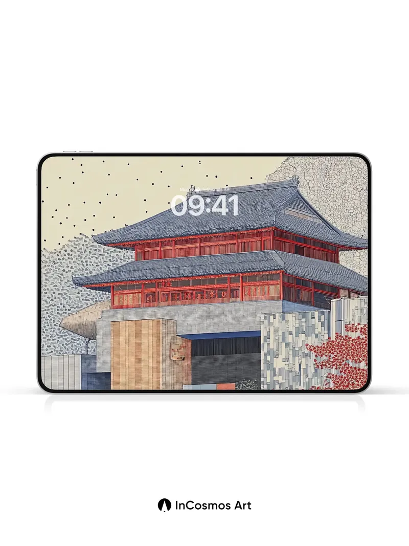 Did you know that Japanese temple architecture once blended spiritual harmony with celestial alignments? Here, ancient red beams meet geometric concrete under a sky scattered with star-like dots, where light breathes through layered textures like ink on rice paper. The autumn maple glows beside stone steps, as if time itself paused to reflect in the stillness of a forgotten courtyard.