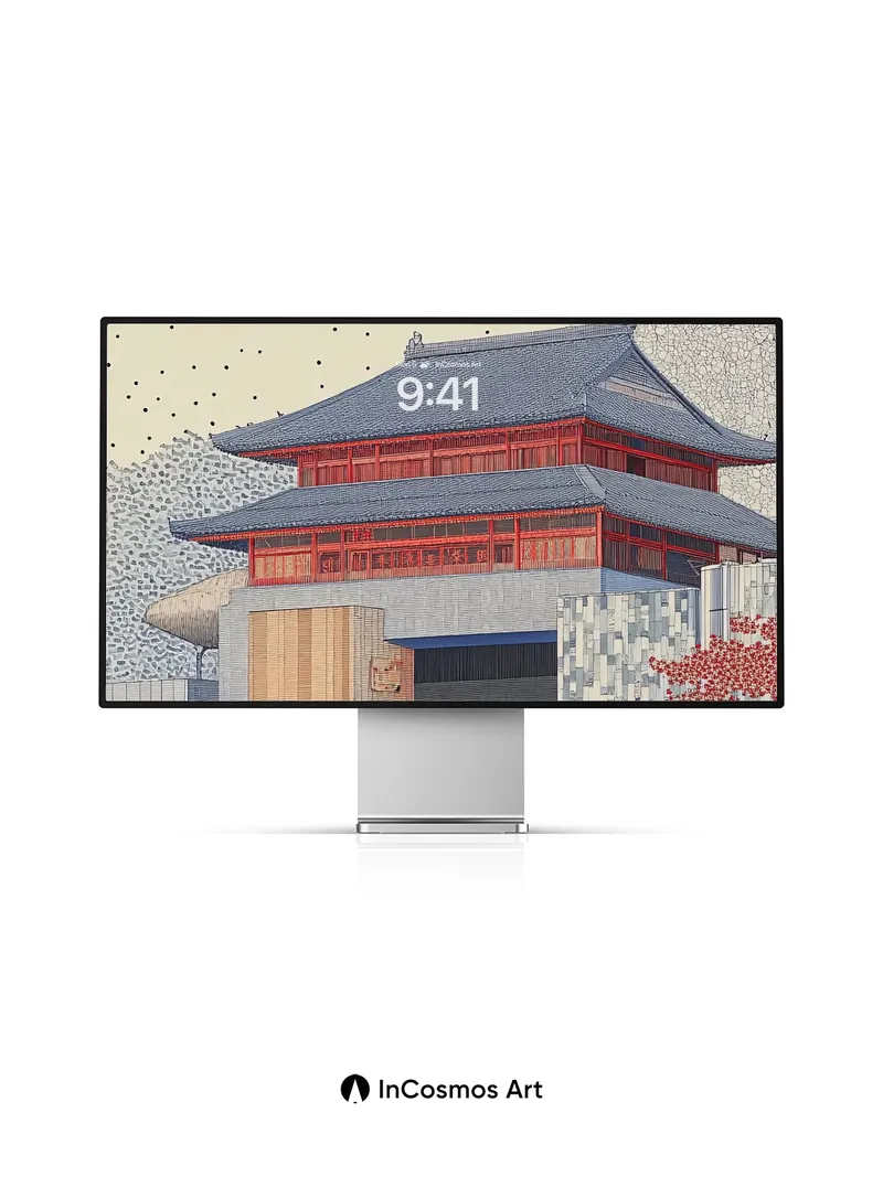 Debug product.metafields.custom.desc: Did you know that Japanese temple architecture once blended spiritual harmony with celestial alignments? Here, ancient red beams meet geometric concrete under a sky scattered with star-like dots, where light breathes through layered textures like ink on rice paper. The autumn maple glows beside stone steps, as if time itself paused to reflect in the stillness of a forgotten courtyard.
