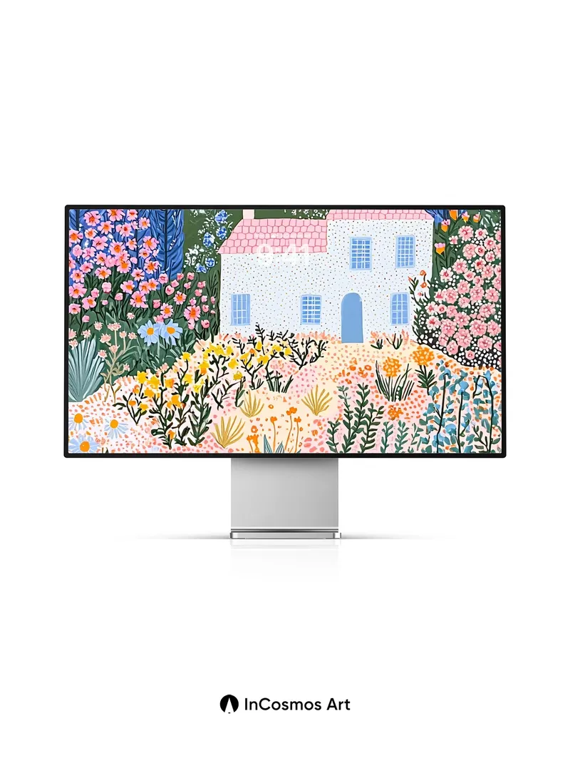 Debug product.metafields.custom.desc: Did you know that cypress trees in Mediterranean landscapes were once believed to ward off evil spirits? Here, they stand like silent sentinels over a cottage nestled in a sea of blooming wildflowers, their deep blue trunks contrasting with the soft blush sky. The garden breathes with layered petals—daisies, poppies, and delphiniums—each stroke of color alive with quiet joy, as if sunlight itself is stitching light into fabric.