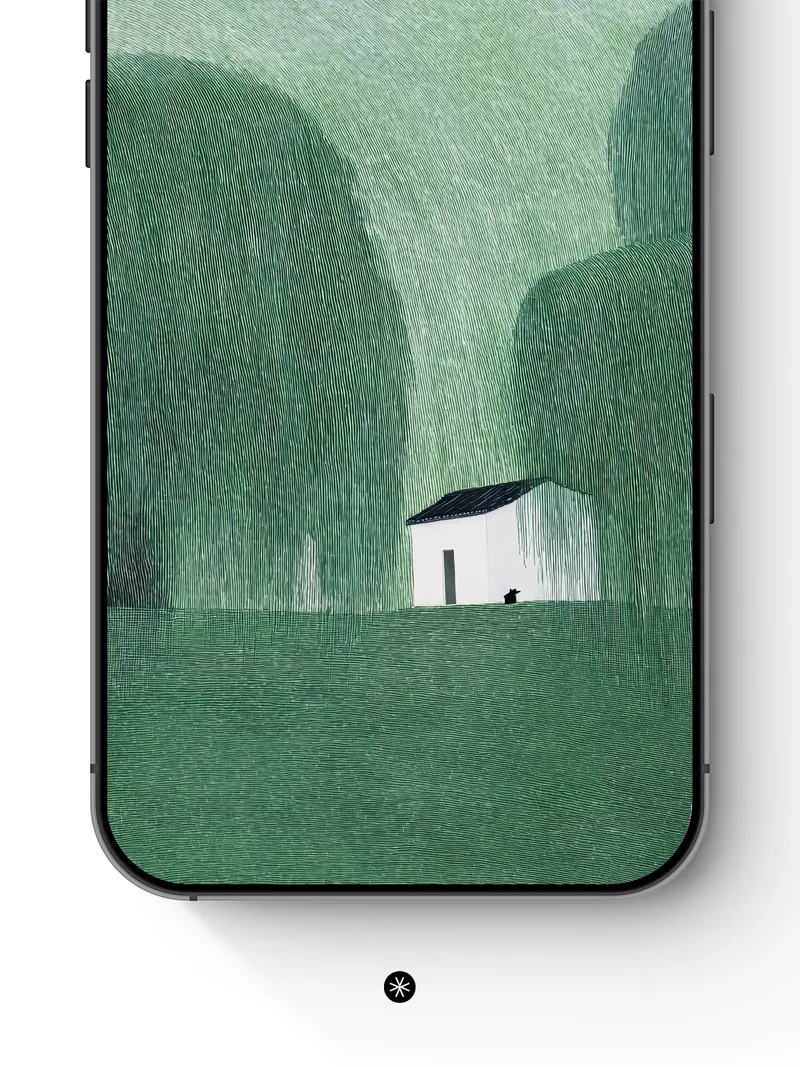 Soft green hills roll gently into the distance, cradling a lone white house beneath a hazy sky. Did you know that the color green is often associated with tranquility and renewal? This wallpaper invites you to pause and breathe in the calm.