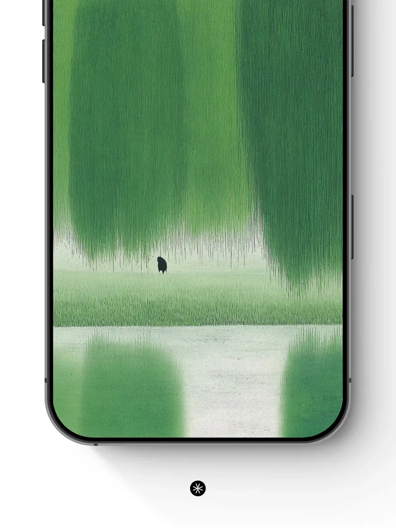 Soft green tones cascade like silk, wrapping the scene in a gentle haze. Did you know green is the most restful color for the human eye? This backdrop invites you into a quiet world of solitude. Share this with your best friend. Send this to your love and swap a matching set. Where does your mind wander in this stillness?