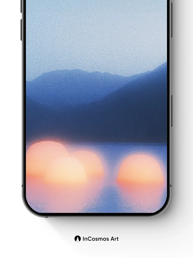 Debug product.metafields.custom.desc: Did you know that the soft glow of twilight can alter your brain’s perception of time? This scene captures a still lake under a hushed sky, where blurred orange orbs float like lanterns on water, their warmth bleeding into the cool indigo depths. The mountains fade into mist, as if breathing slowly in the quiet of dusk, while the light crawls across the surface like a memory just out of reach.
