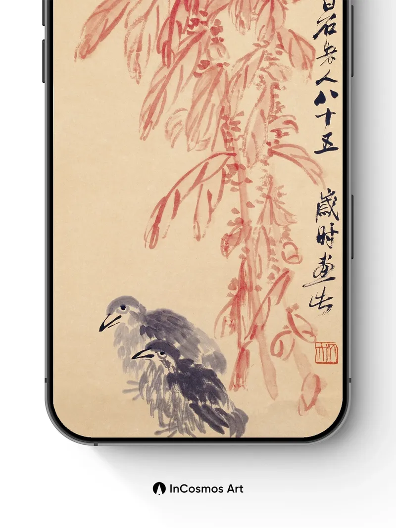 Debug og_description: Did you know that in traditional Chinese ink painting, the brushstroke carries the breath of the artist? Here, two birds rest beneath a cascade of crimson leaves, their feathers rendered in soft charcoal-gray strokes that seem to absorb the quiet light. The red foliage drifts like embers on still air, each leaf outlined in delicate tremors of pigment—alive with the weight of silence and time.