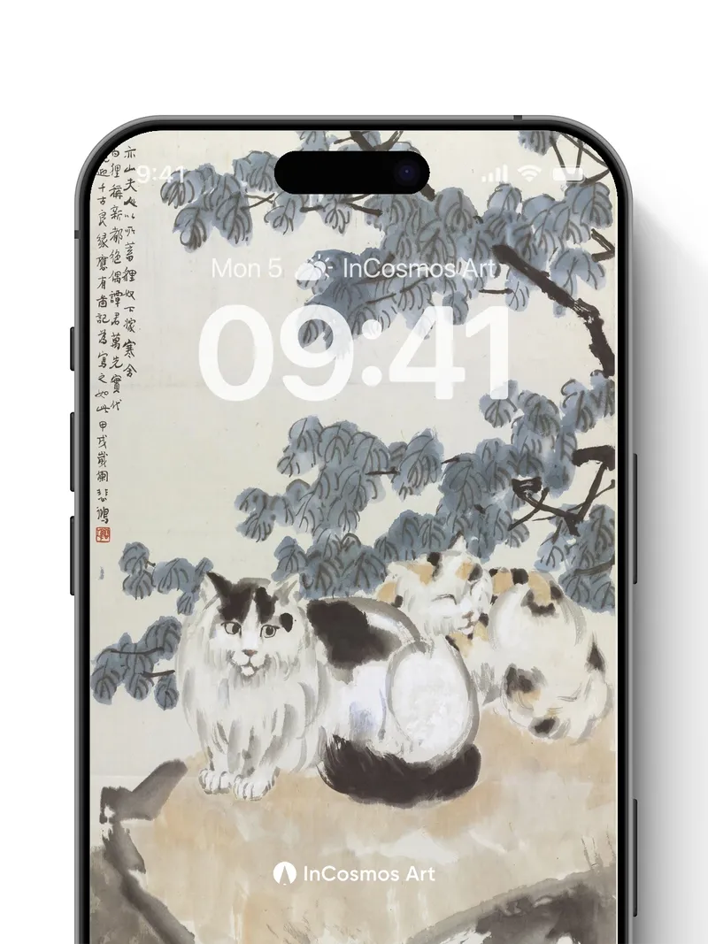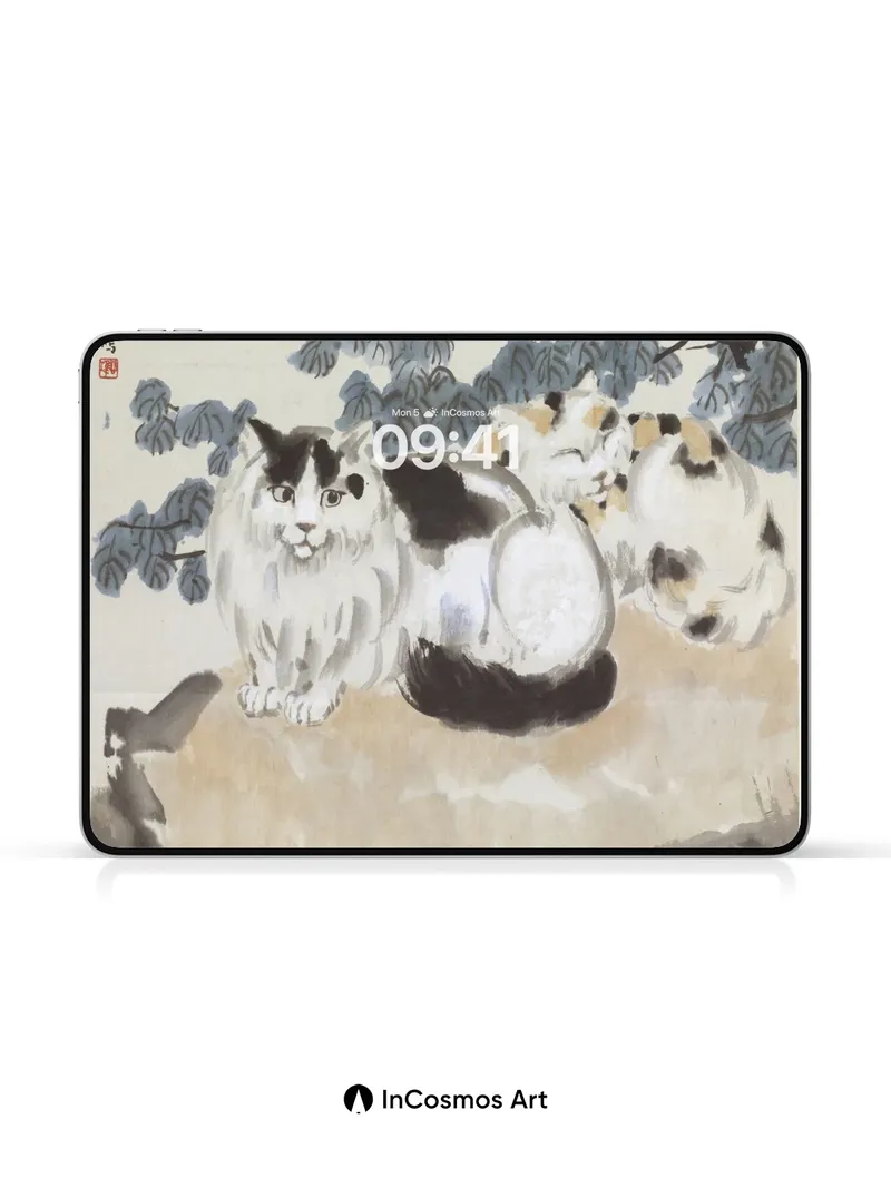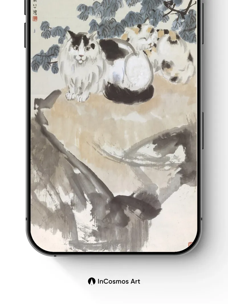 Debug product.metafields.custom.desc: Did you know that traditional Chinese ink wash paintings were once used to meditate on nature’s quiet rhythms? Here, three cats rest beneath a willow’s shadowed canopy, their fur brushed in soft charcoal and silver, eyes holding stillness like mist over stone. The trees breathe in layered indigo, each leaf a whisper of wind, while the rock below glows with earthy warmth—like memory made solid.