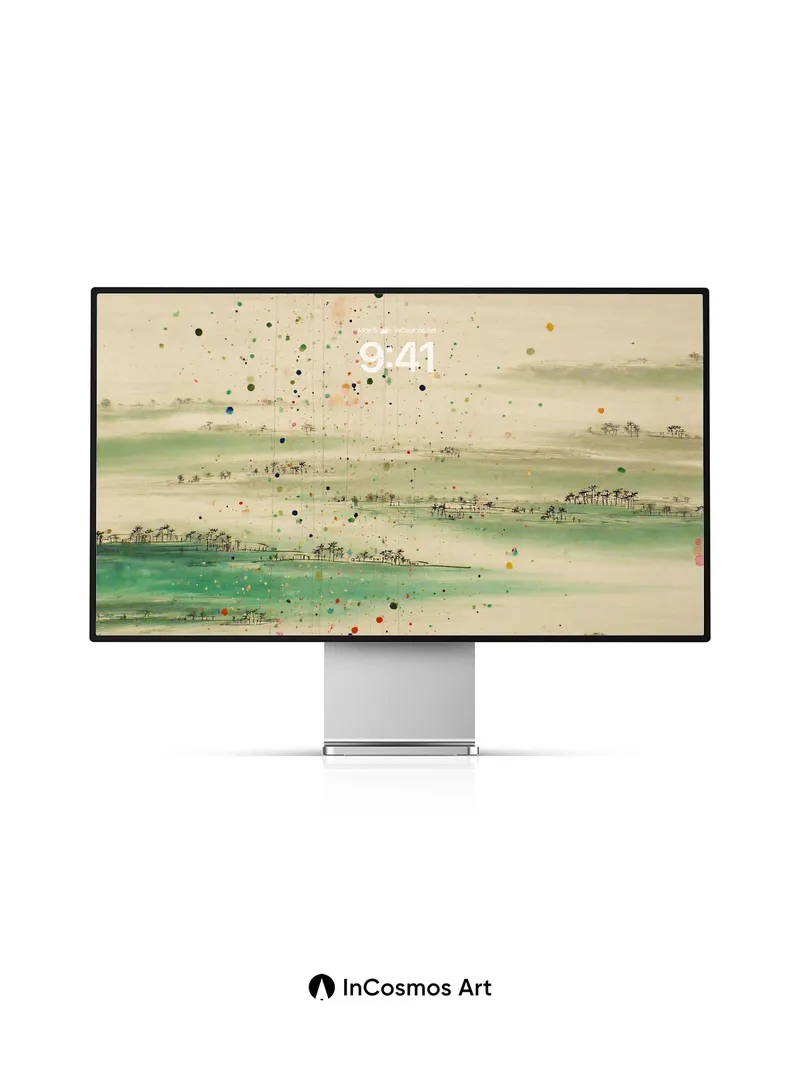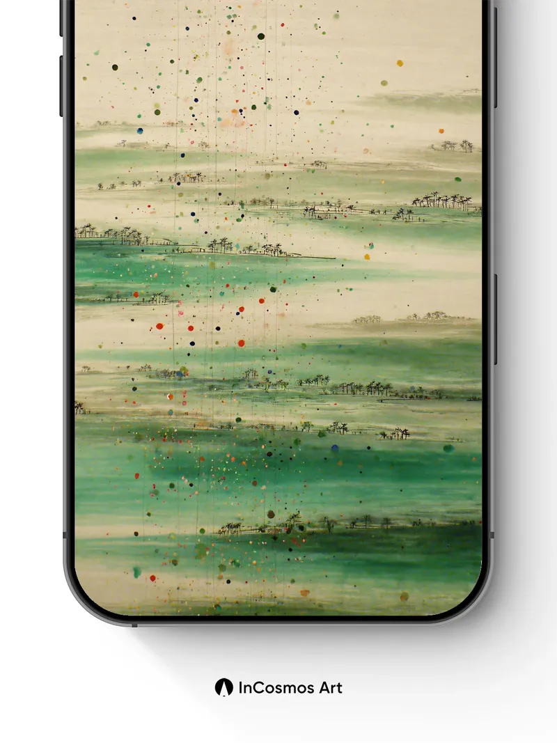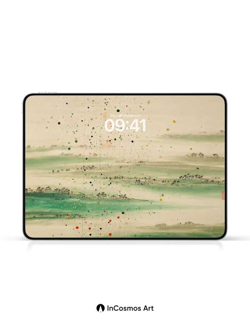 Soft layers of seafoam green and ivory drift across the surface, resembling a landscape seen through heavy, humid air. Did you know that traditional Japanese ink wash paintings often leave vast empty spaces to represent mist? This design captures that same quiet, breathing room.