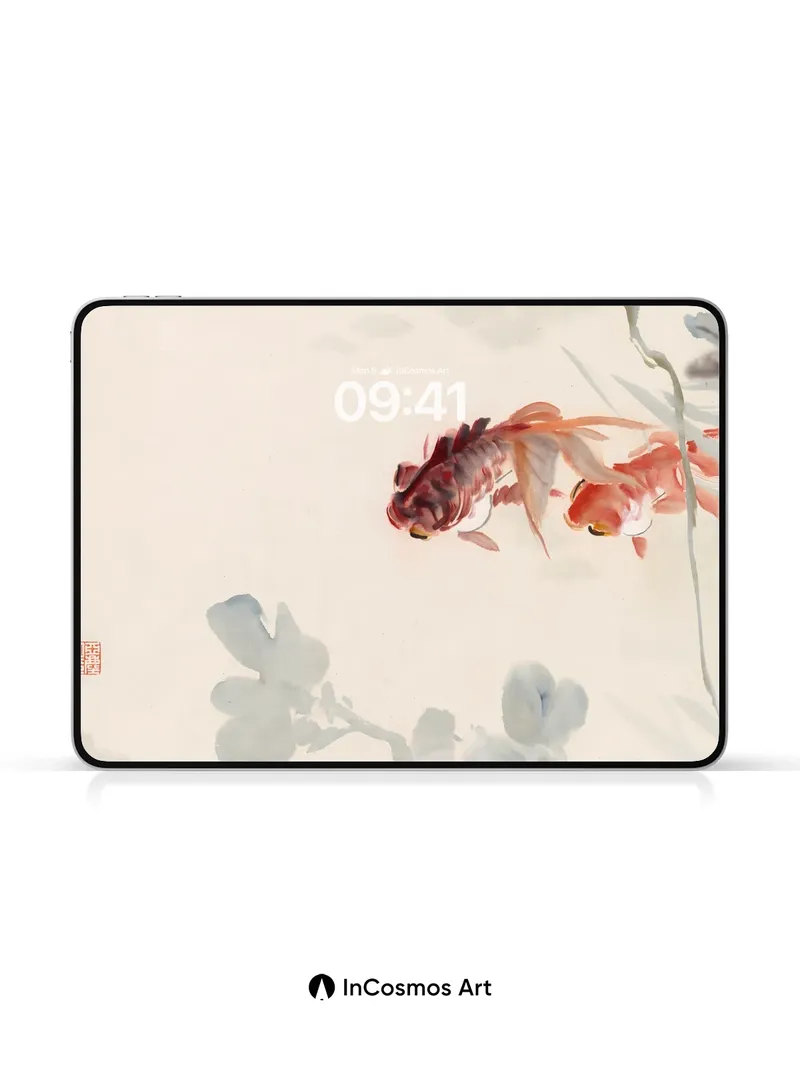 Serene Koi Garden Wallpaper with Ink-Washed Leaves