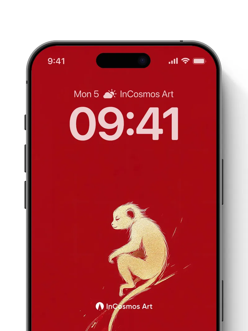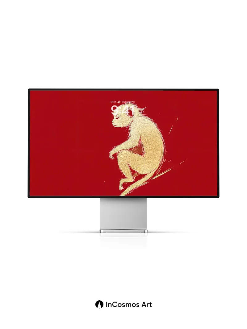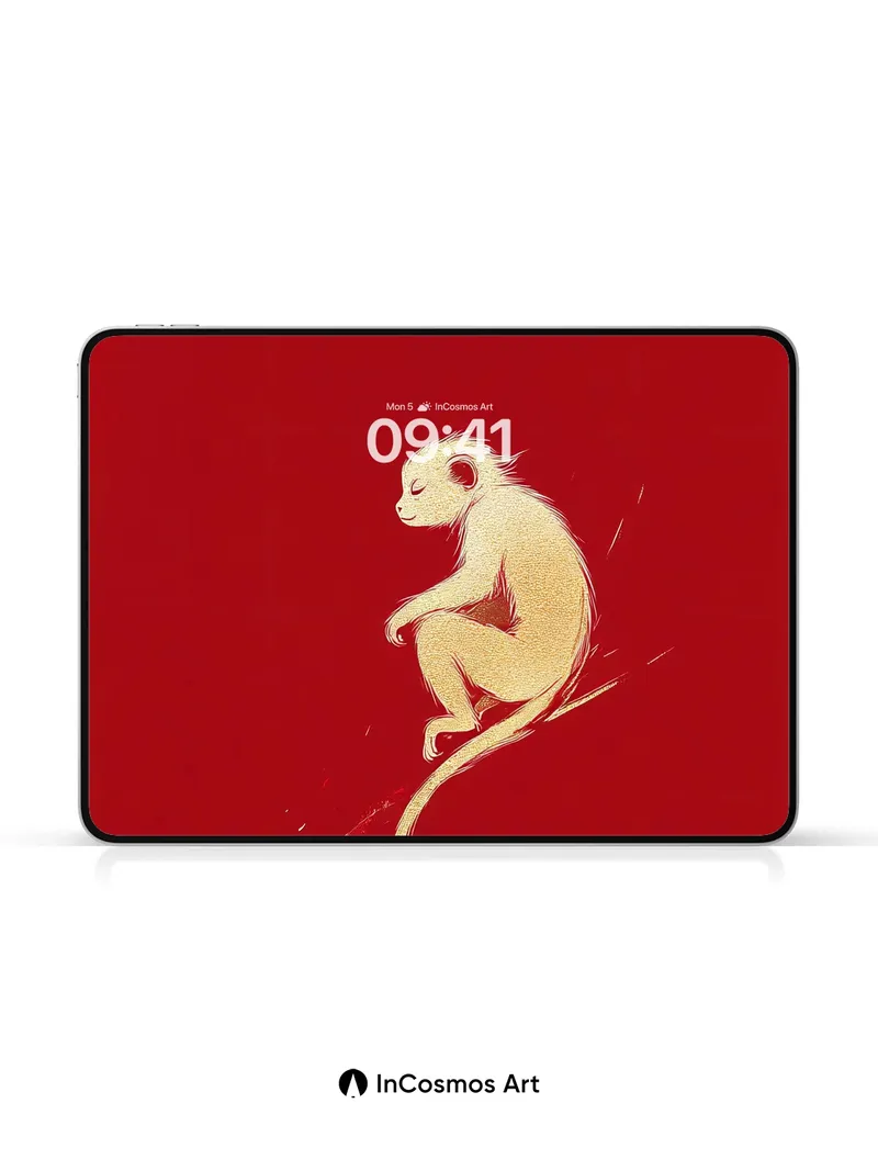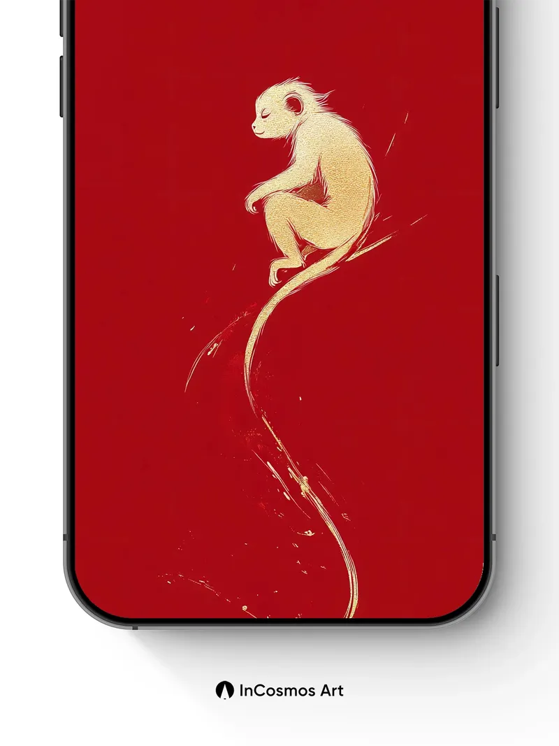 Debug page_description: Did you know that in Chinese zodiac tradition, the monkey symbolizes intelligence and curiosity? This delicate figure perches on a golden calligraphic line, its fur softly brushed like powdered silk against a deep crimson void. The light crawls over its form in gentle strokes, as if time itself paused to admire the stillness. You feel the quiet hum of contemplation, the kind that only comes when nature and art breathe together. Share this with your best friend. Send this to your love and swap a matching set. What if silence could speak in gold?