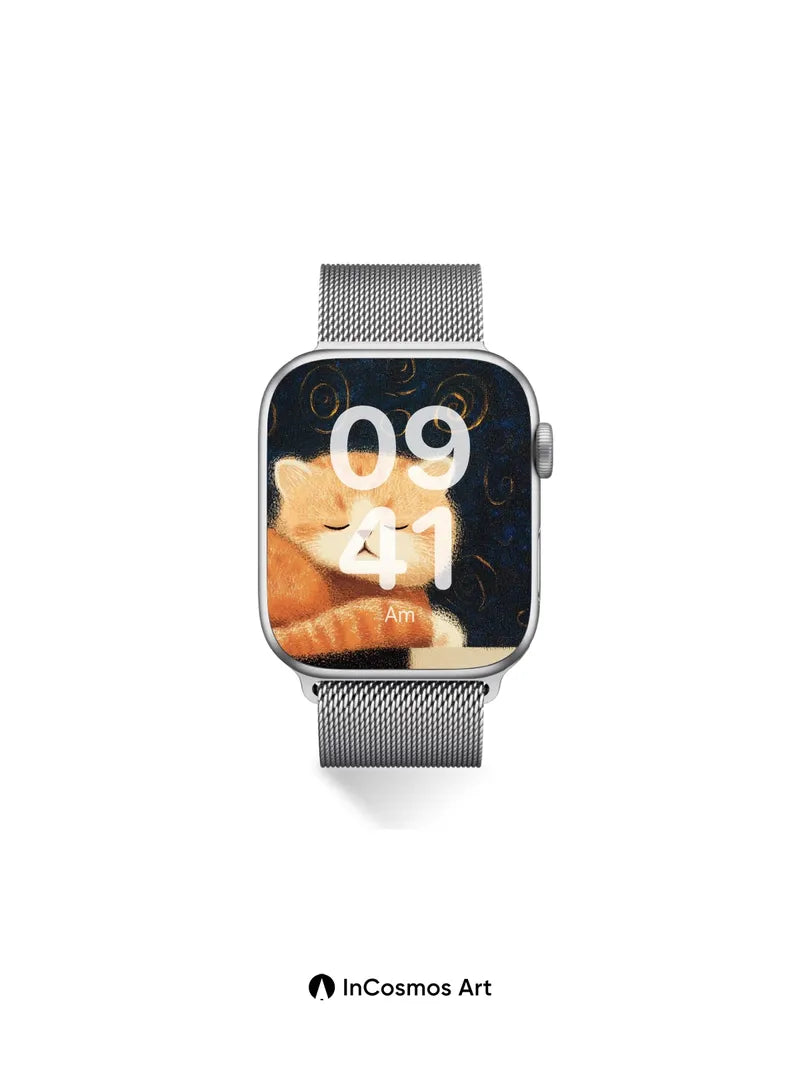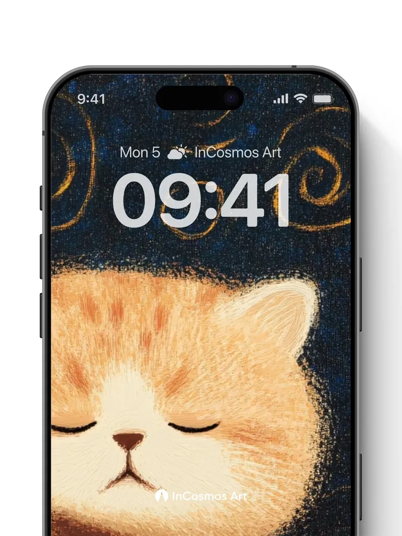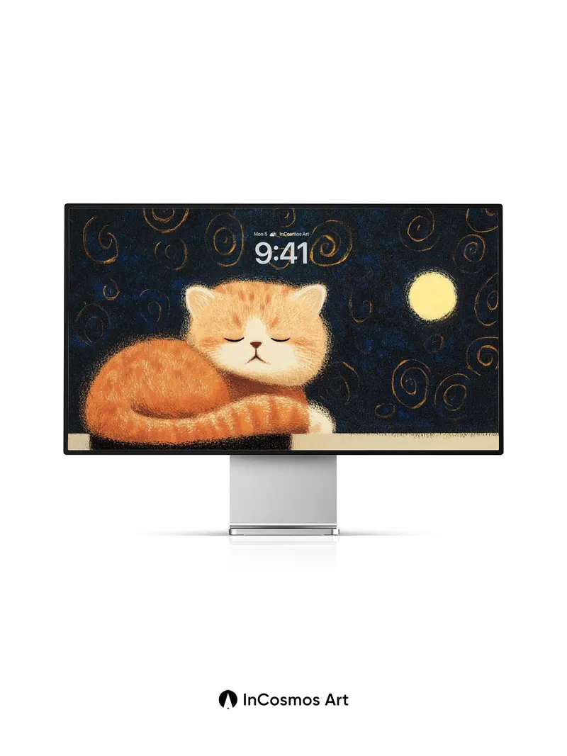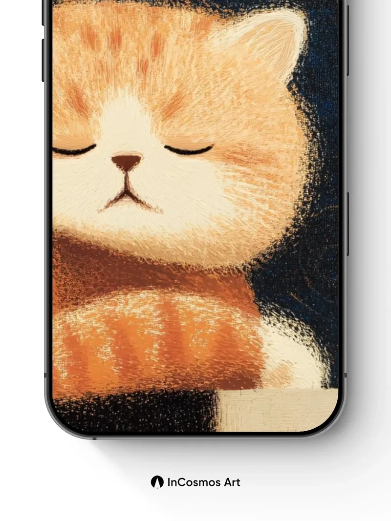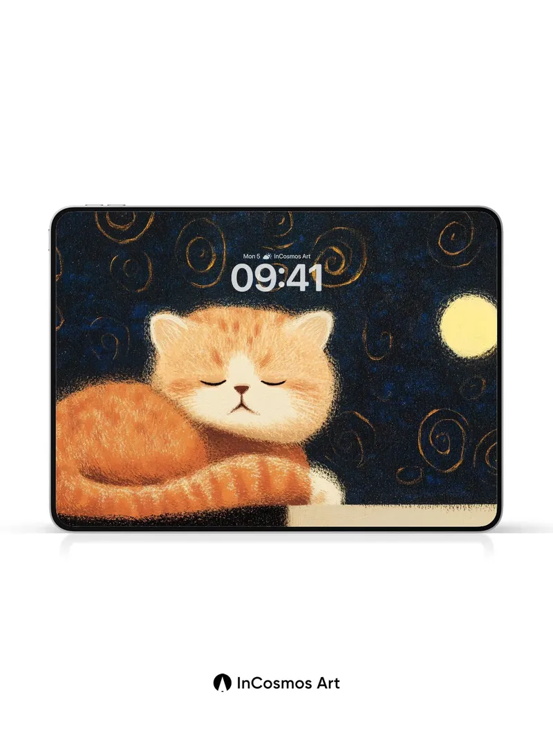Debug product.metafields.custom.desc: Did you know that cats can see in near-complete darkness, their pupils dilating to capture the faintest starlight? Here, a ginger feline curls into soft repose beneath a luminous moon, its fur glowing like spun amber against a sky of deep indigo swirls—each curl a whisper of Van Gogh’s cosmos. The night breathes around it, golden spirals dancing like stardust caught in time.