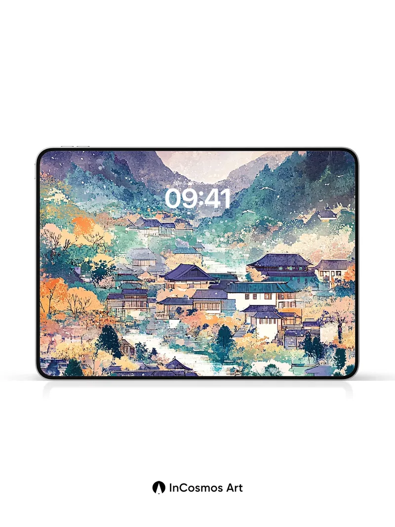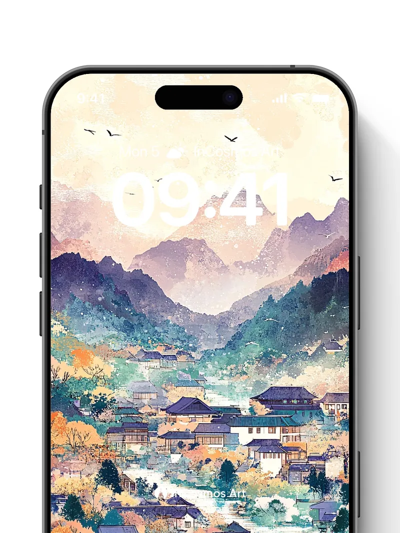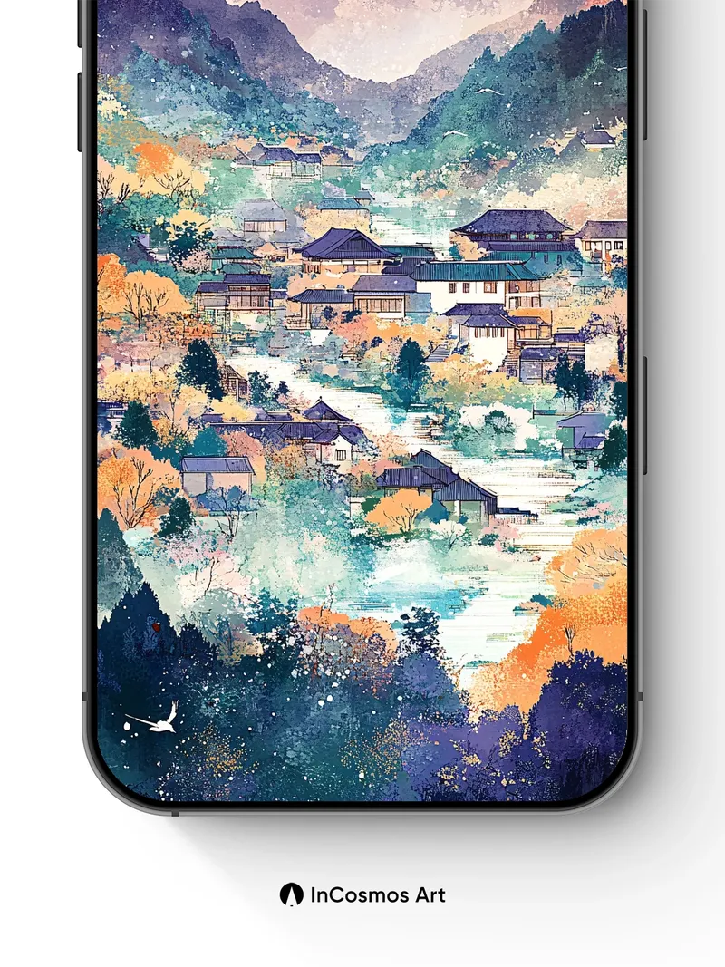 Serene Mountain Village Wallpaper with Autumn Hues