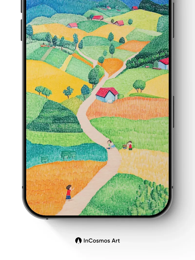 Debug page_description: Did you know that in traditional Japanese art, the curve of a path symbolizes life’s journey? Here, color breathes through every hillside—emerald fields pulse like living moss, golden crops shimmer under a sky painted in soft cerulean strokes. A winding trail traces its way through villages tucked into valleys, where tiny figures walk as if whispering secrets to the wind. The mountains rise in hushed layers, their blue depths fading into mist, while trees stand like quiet sentinels. This is not just a landscape—it’s a story written in light and soil. Share this with your best friend. Send this to your love and swap a matching set. What if every step on this path led to a memory you’ve forgotten?