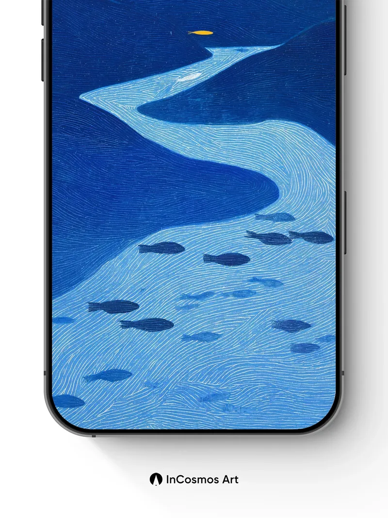 Did you know that ancient Japanese woodblock artists used hand-carved blocks to create flowing lines like these? The river glows with a quiet pulse, its surface etched in delicate waves, while dark fish swim beneath a sky stitched with stars and a single golden moon. You’re not just looking at water—you’re floating through it, where silence hums and light breathes through the deep.